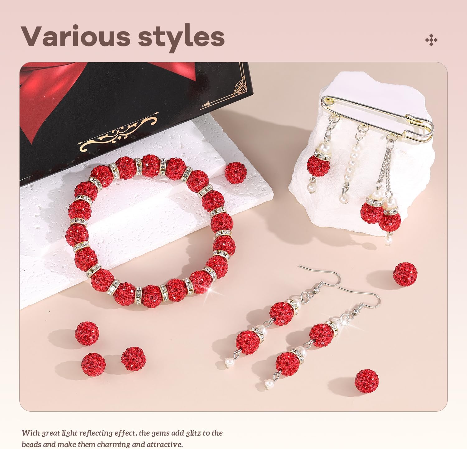 200pcs 10mm Rhinestone Beads for Jewelry Making, Red Shiny Round Disco Ball Beads Bulk, Sparkle Crystal Clay Christmas for Bracelet Baseball Necklace Earring Crafting and DIY