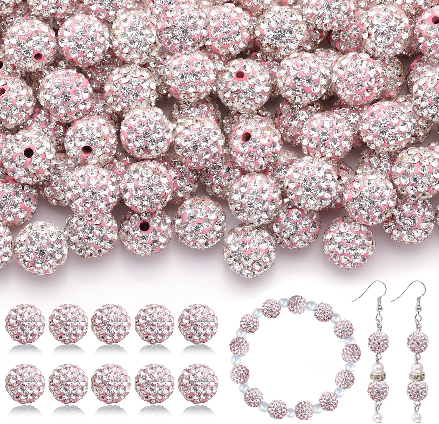 105pcs 10mm Rhinestone Beads for Jewelry Making, Pink White Shiny Round Disco Ball Beads Bulk, Sparkle Crystal Clay Christmas for Bracelet Baseball Necklace Earring Crafting and DIY