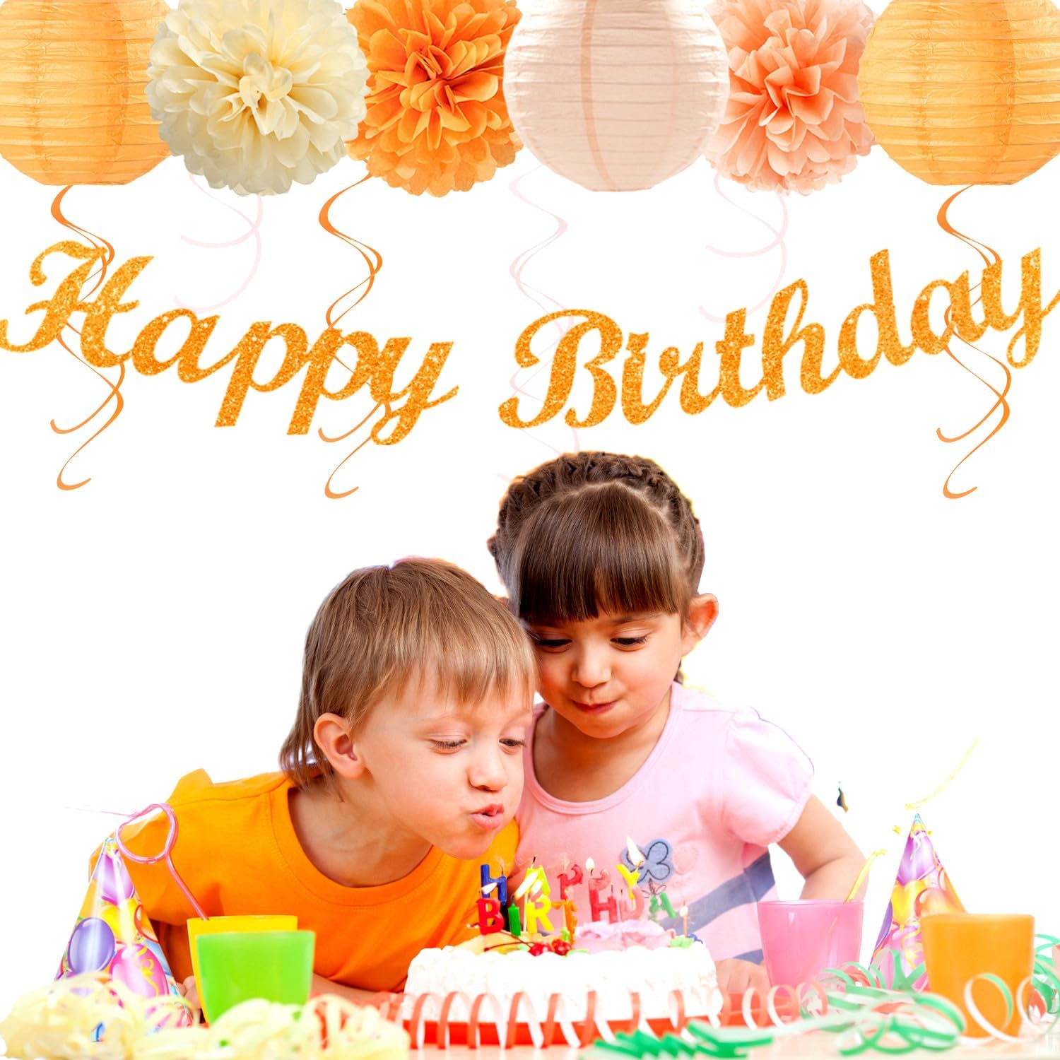 • 【Orange beige peach pink Birthday kits】This kits include 1pcs happy birthday banner, 1pcs circle dots paper banner, 4pcs tissue pom poms: 3pcs 10" and 1pcs 12" , 3pcs 8inch paper honeycom ball, 2pcs 8inch paper lantern, 4pcs 12inch paper flower fan, 6pcs Paper swirls hanging streamers