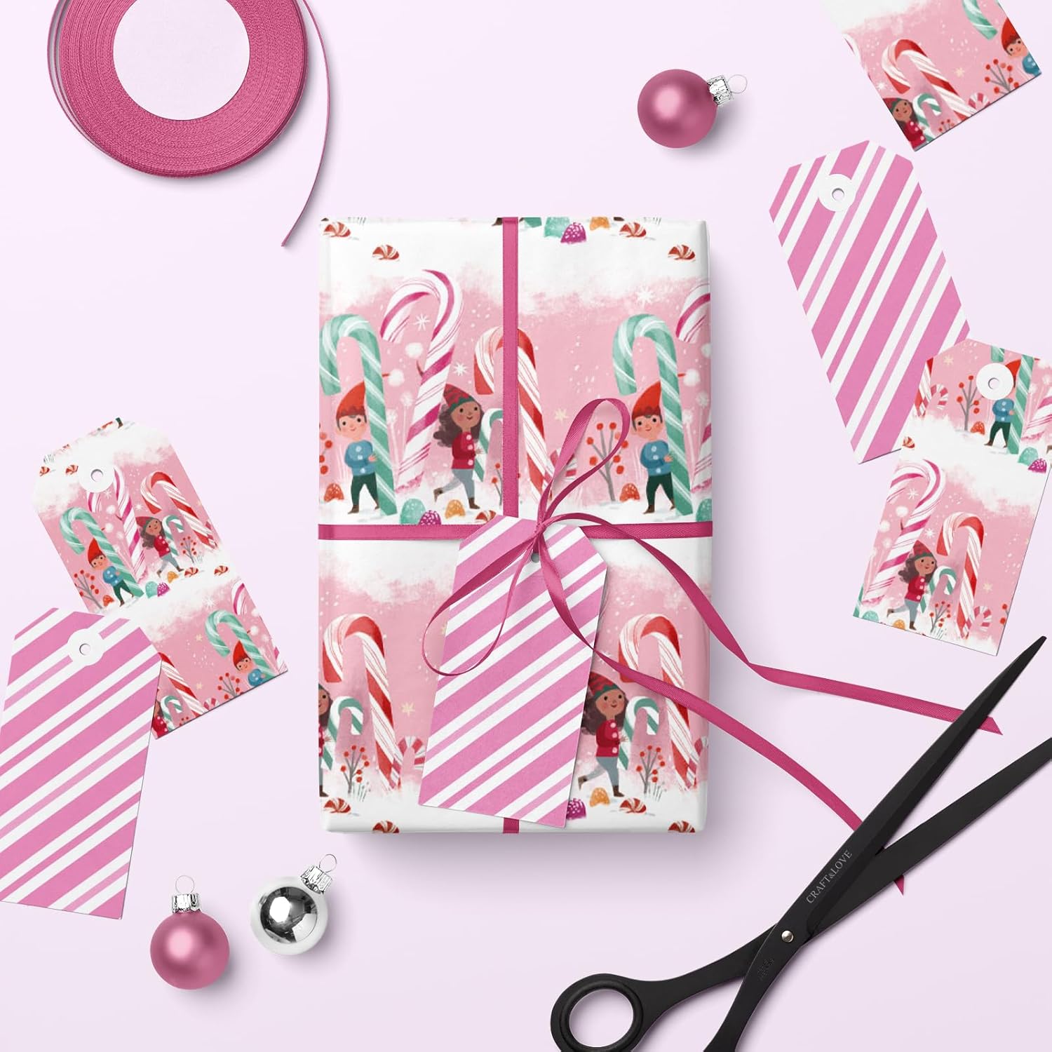 • Sweet & Whimsical Design: Features two festive designs in one roll—front side showcases playful kids, giant candy canes, and a snowy pink background; reverse side has vibrant pink-and-white candy stripes for a modern twist.