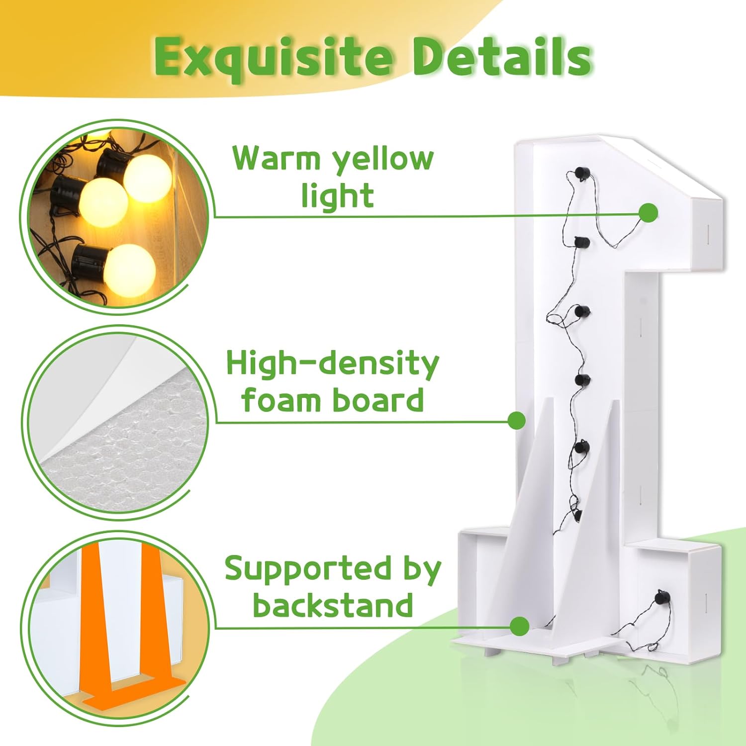 • Equipped with 2 Yellow Light Strings: Large marquee numbers include matching light strings, so you can say goodbye to the annoyances of incompatible light strings.