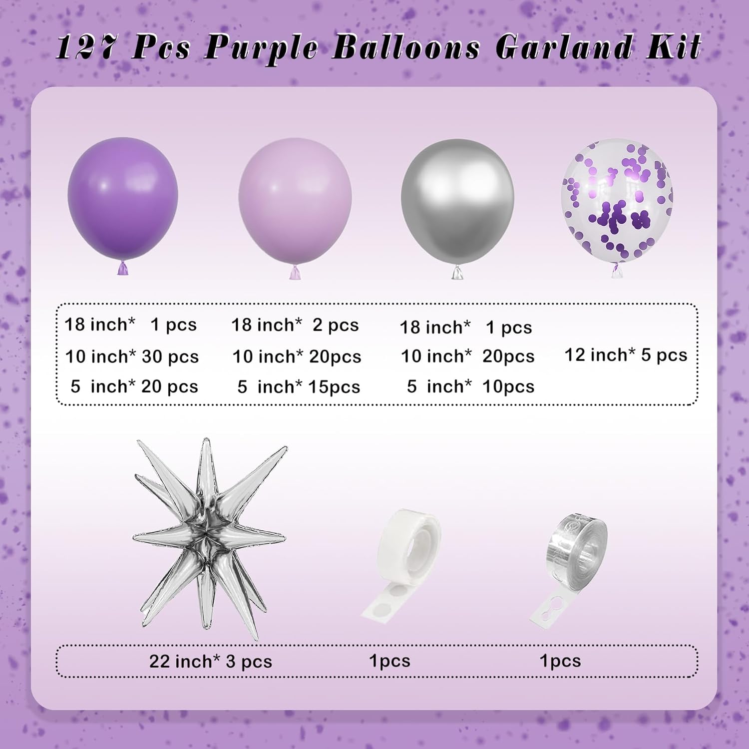 • 【Package Include】- The purple balloon arch kit includes silver starburst balloons 22”3pcs,lavender purple balloons(18”1pcs+10”20pcs+5”15pcs),light purple balloons(18”2pcs+10”30pcs+5”20pcs),metallic silver balloons(18”1pcs+10”20pcs+5”10pcs),purple confetti balloons 12”5pcs,balloon glue dot;balloon decorating strip.