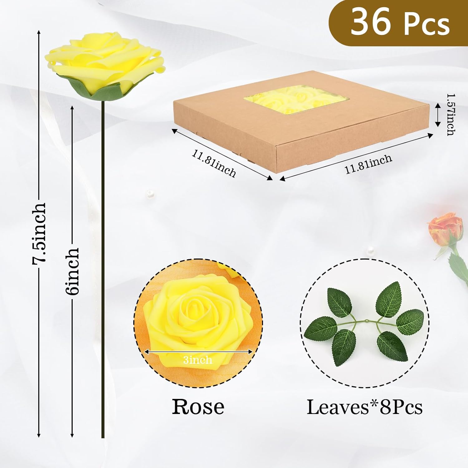 BLEUM CADE 36Pcs Artificial Flowers Fake Roses with Stems, Yellow Boxed Foam Roses for DIY Bouquets Centerpieces Wedding Party Arrangement Bridal Shower Decor