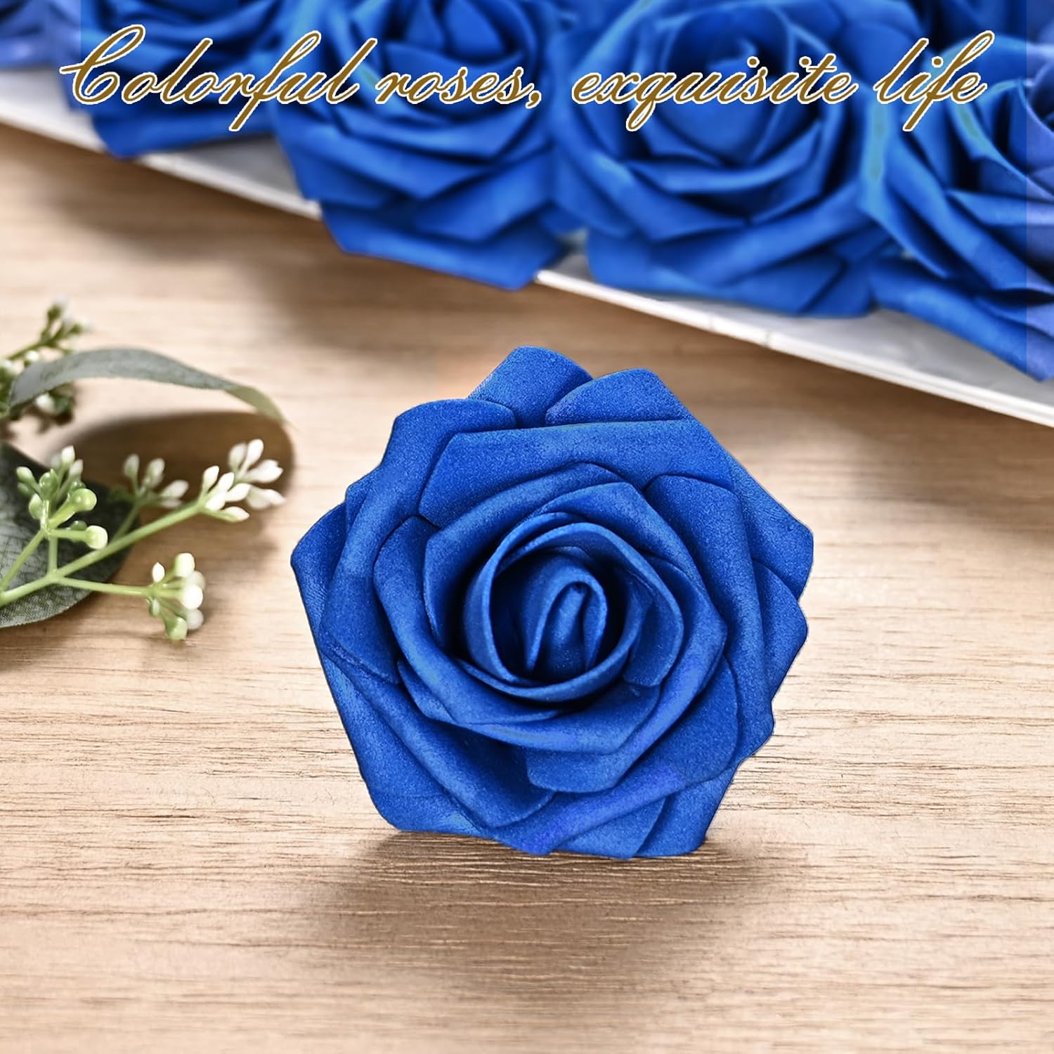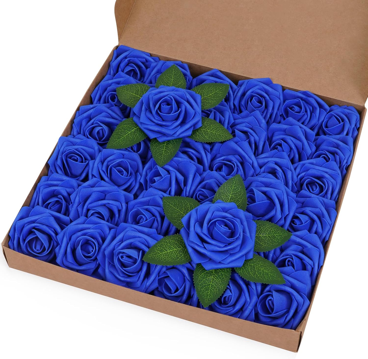 BLEUM CADE 36Pcs Artificial Flowers Fake Roses with Stems, Royal Blue Boxed Foam Roses for DIY Bouquets Centerpieces Wedding Party Arrangement Bridal Shower Decor