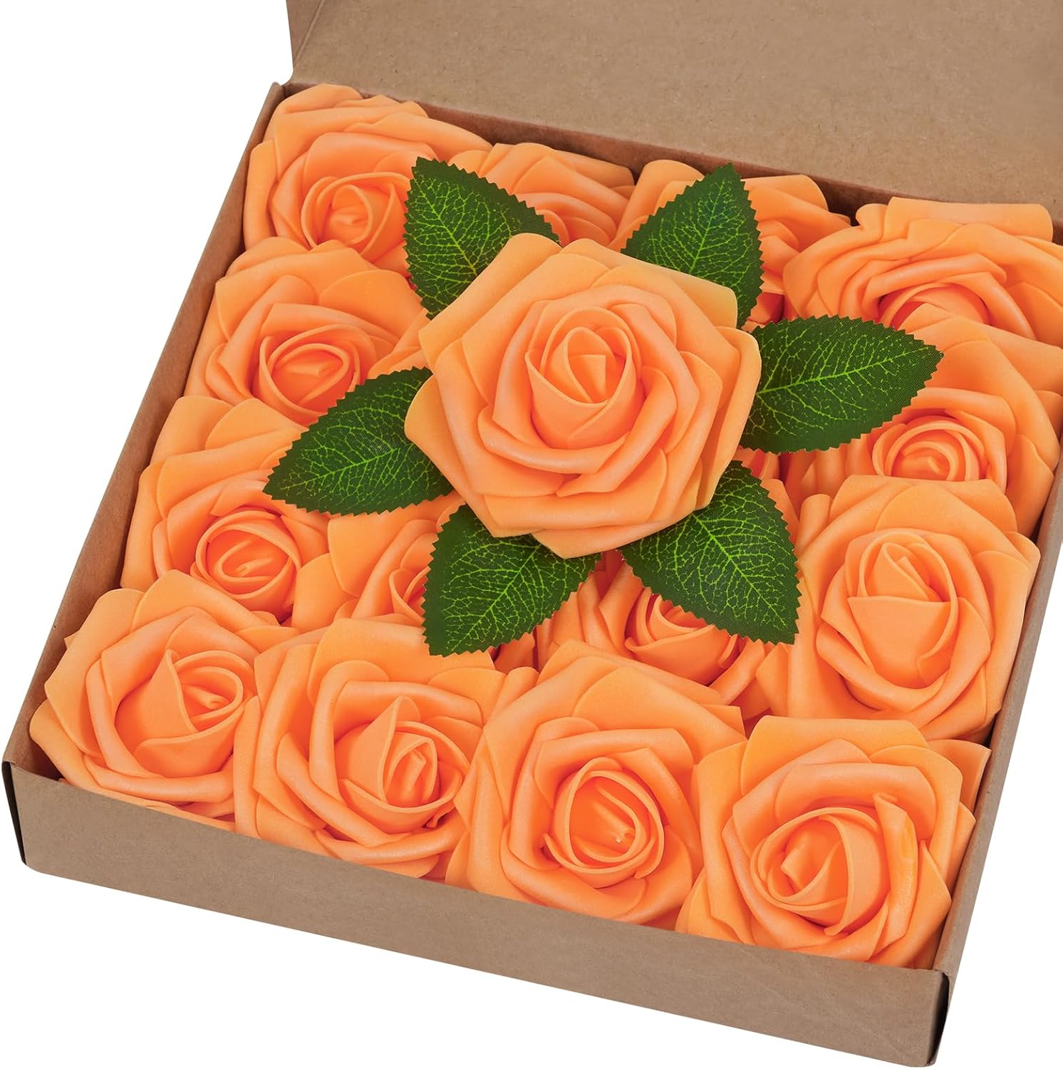 BLEUM CADE 16Pcs Artificial Flowers Fake Roses with Stems, Orange Boxed Foam Roses for DIY Bouquets Centerpieces Wedding Party Arrangement Bridal Shower Decor