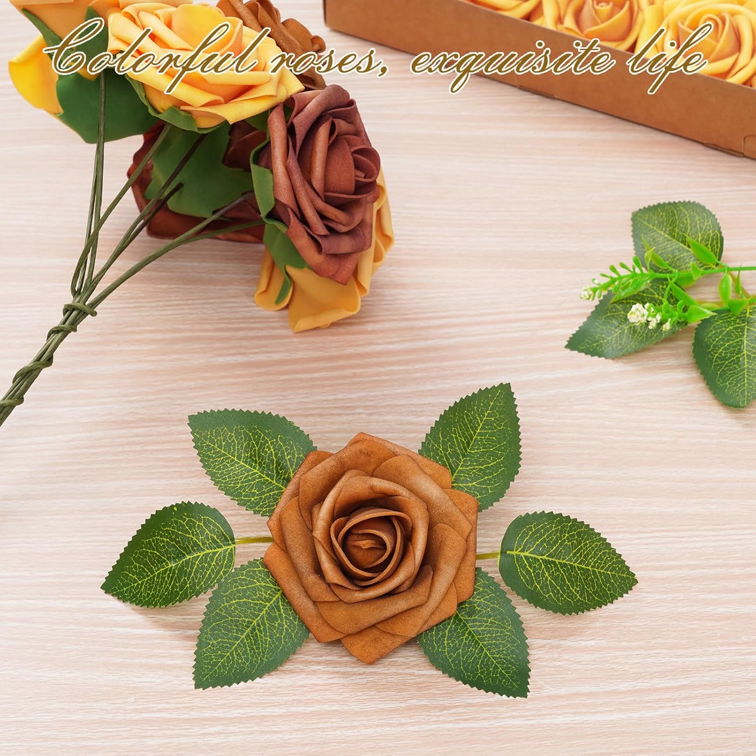 BLEUM CADE 36Pcs Artificial Flowers Fake Roses with Stems, Gradient Burnt Orange Boxed Foam Roses for DIY Bouquets Centerpieces Wedding Party Arrangement Bridal Shower Decor