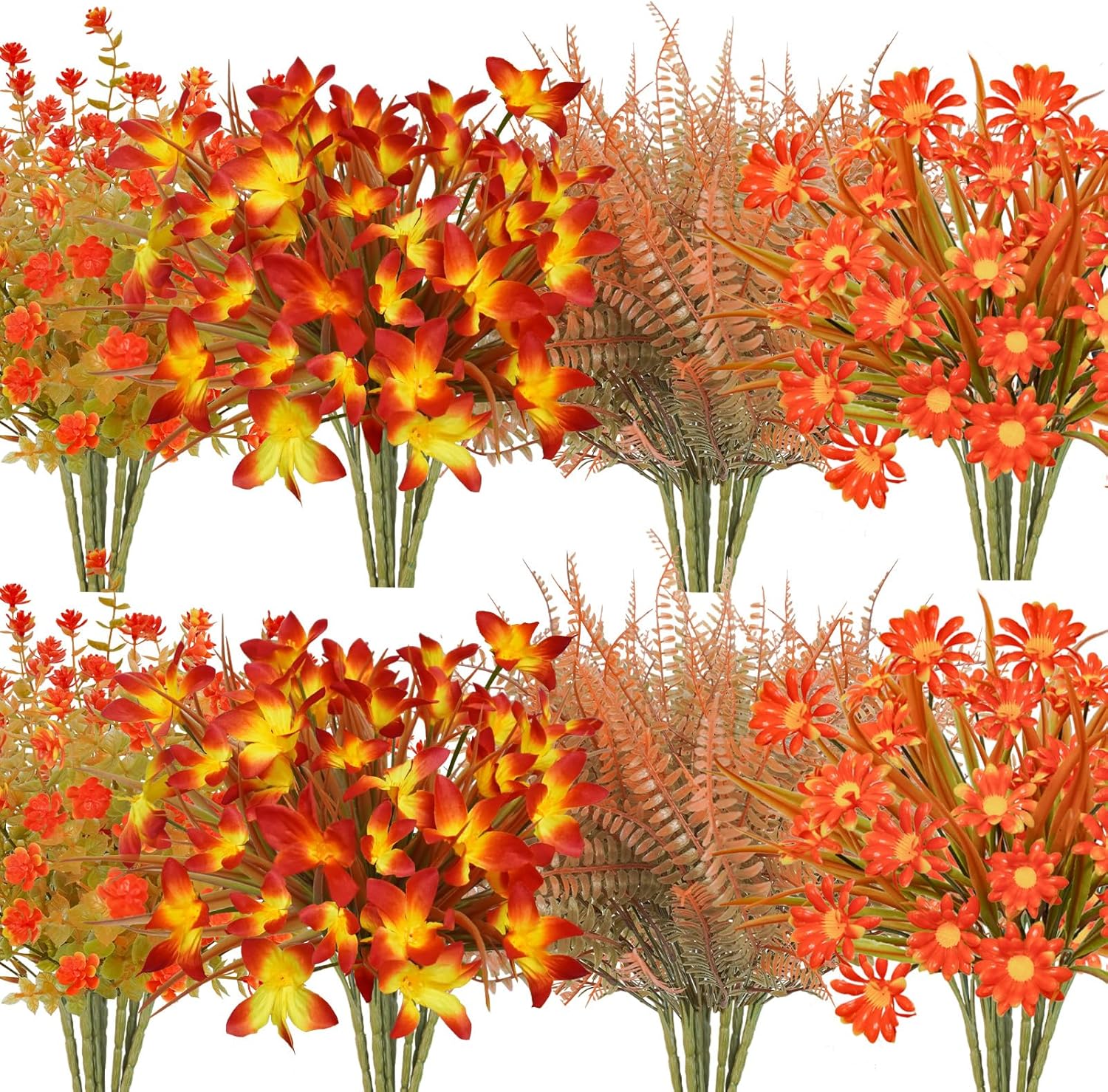 • Fall Beauty Combo: Pack of 16 pcs, including 4 pcs fall greenery stems, 4 pcs fall fake flowers, 4 pcs fall Boston fern, and 4 pcs fall morning glory flower. Various sizes and styles of fall plants are mixed