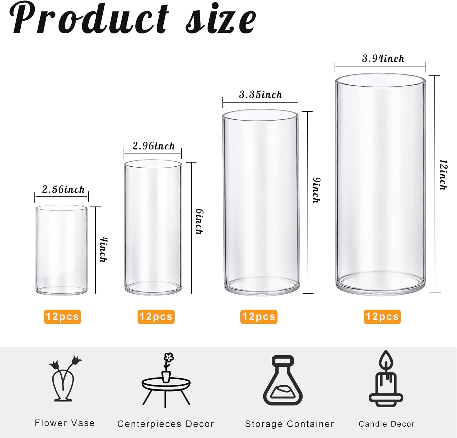 48 Pack Thick Glass Cylinder Vases 4,6,9,12 Inch Tall Clear Flower Vase Hurricane Floating Candle Holder for Table Centerpiece Wedding Home Decor