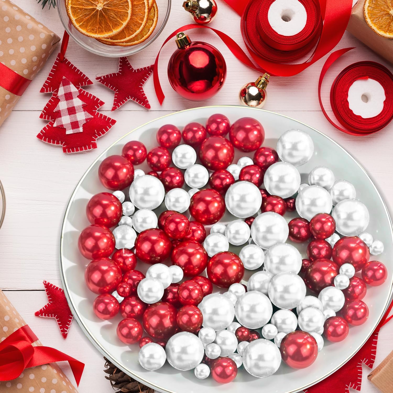 150Pcs Red&White Polished No Hole Pearl Beads Vase Filler, Christmas Vase Filling Decorations, Plastic Pearls, Table Scatters, Wedding Home Decor, 8/14/20 mm