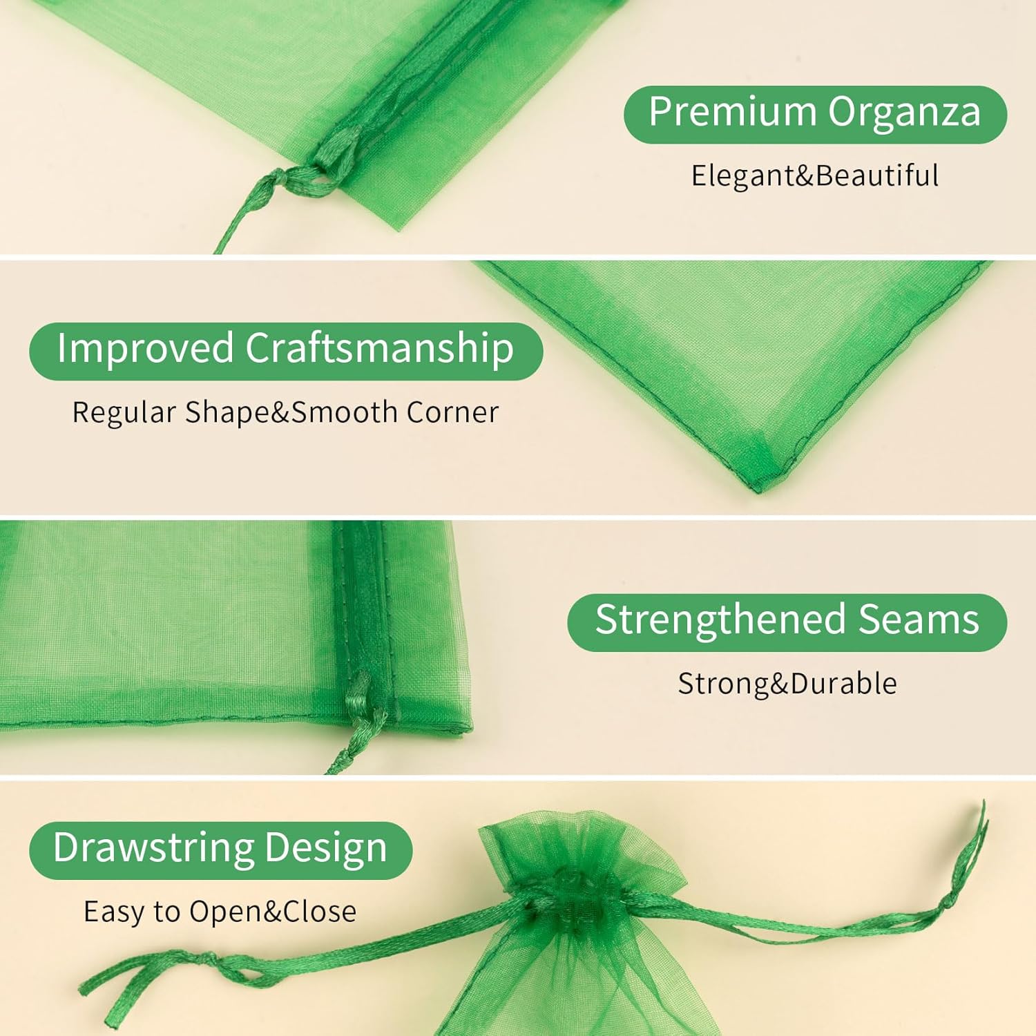 • Package Details: Package comes in 50 pcs green organza bags, with a size of 5x7 inch, offering a practical and stylish solution for organizing and presenting small items.