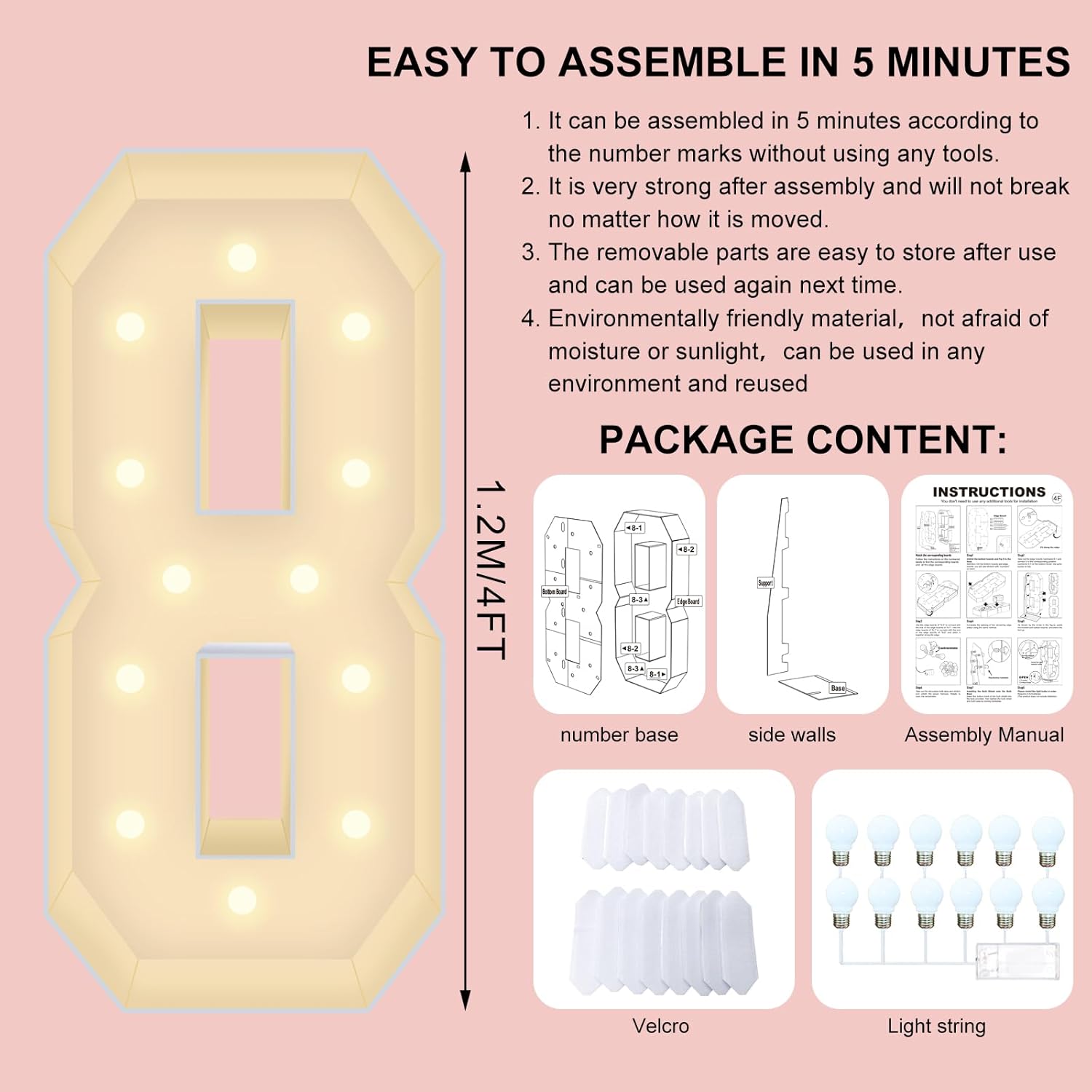 • Quick and Easy, No Tools Required: You can easily assemble marquee numbers 4 feet tall! Made of Corrugated plastic board, it is waterproof and sturdy in structure. Just align the same number parts, and the installation can be easily and quickly completed without any tools, ensuring that you can easily prepare for your party.