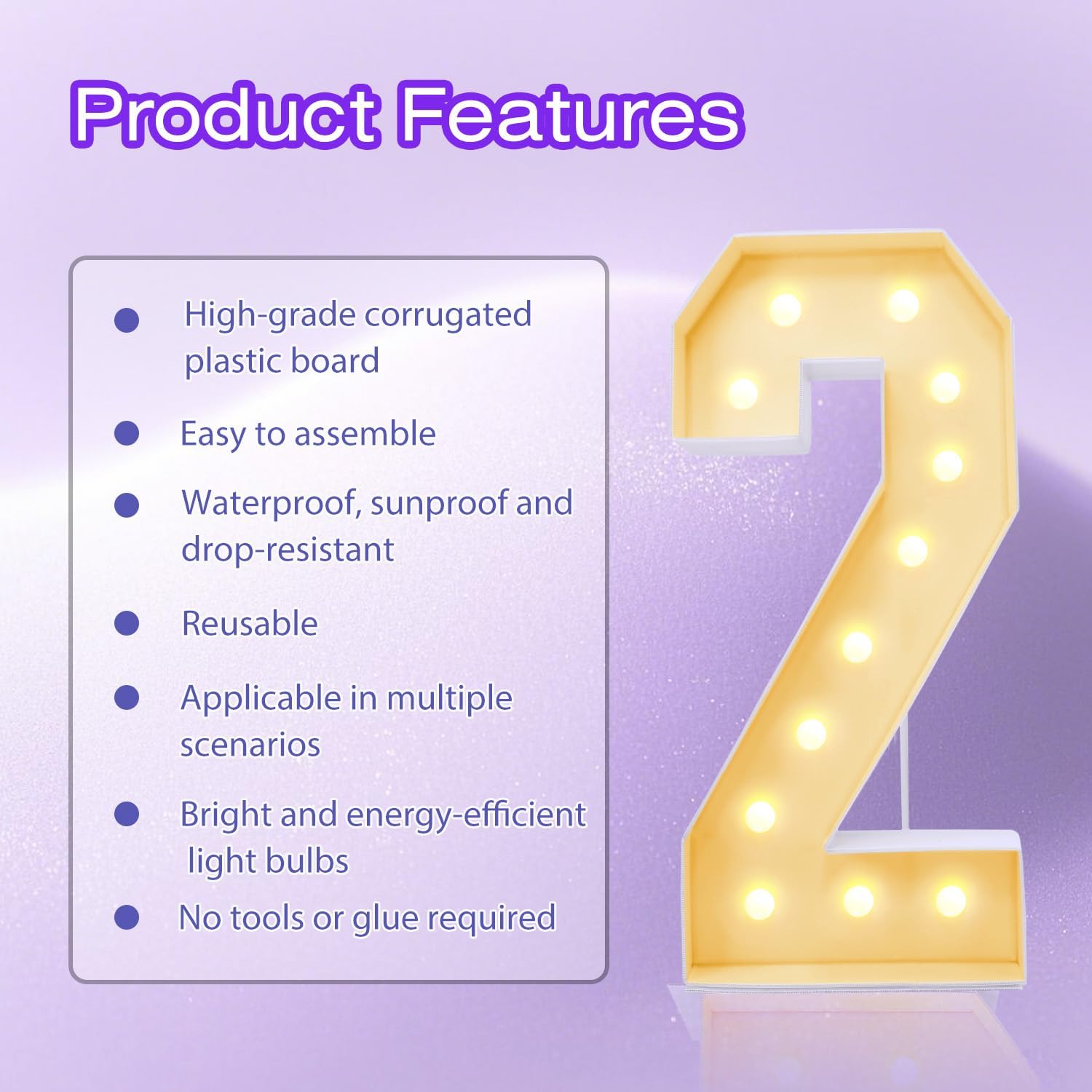4FT Plastic Marquee Numbers 2 - Light up Numbers Are Made from Corrugated Plastic Board - Quick Assembly Without Tools, Disassembled Components Can Be Used for Photo Wall Decoration, Yard Sale Signs