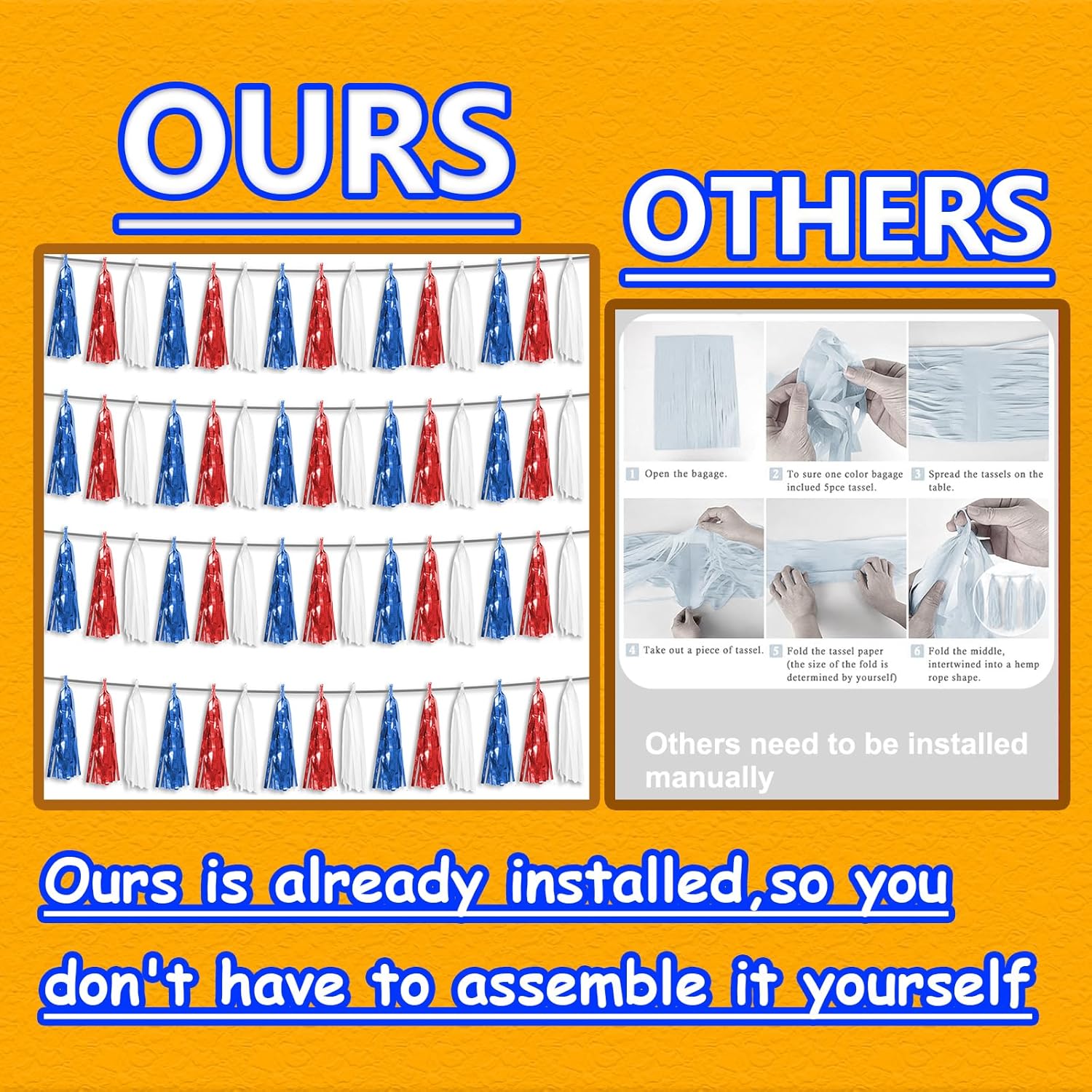 • 【Package Includes】The total length of the white blue red birthday tassels banner is 40 feet, divided into 4 strips, each 10 feet long. Each banner contains 15 tassels, and each tassel measures 14 inches, for birthday decorations many occasions uitable for Patriotic display, Homecoming Float, Christmas Float, ecorative metal trailers, 4th of july floats, graduation floats etc