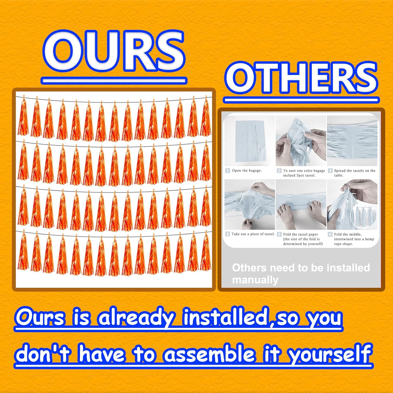 • 【Package Includes】The total length of the orange birthday tassels banner is 40 feet, divided into 4 strips, each 10 feet long. Each banner contains 15 tassels, and each tassel measures 14 inches, for birthday decorations many occasions uitable for Patriotic display, Homecoming Float, Christmas Float, ecorative metal trailers, graduation floats etc
