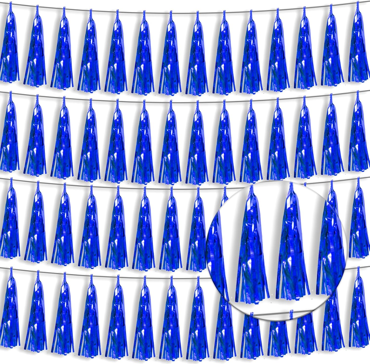 4P Blue Foil Fringe Tassel Banner Garland Metallic Tinsel Streamers Wall Hanging Curtain Backdrop Banner for Parade Floats, 2024 Graduation Decorations, Retirement Party Decoration