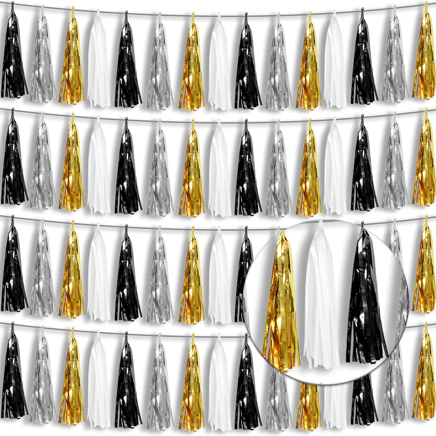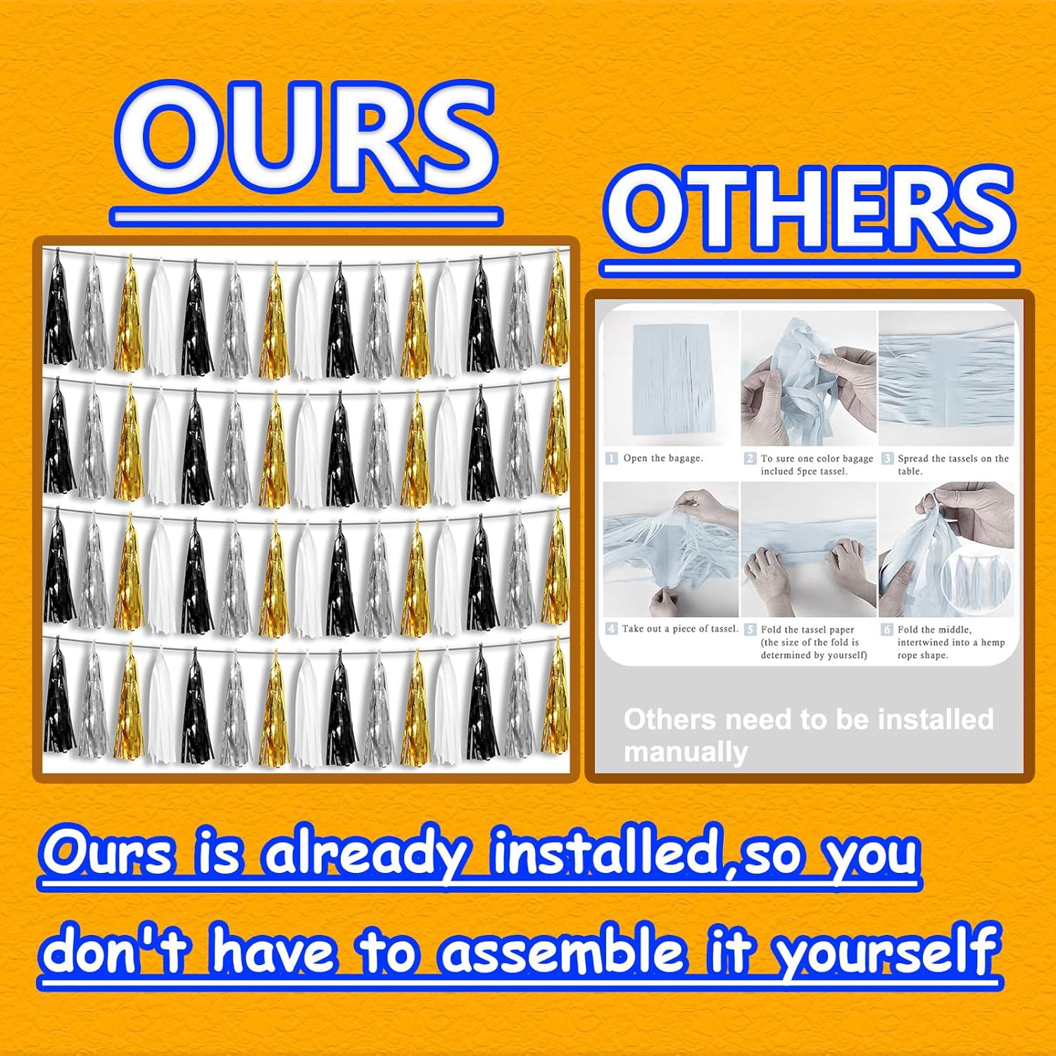 • 【Package Includes】The total length of the black gold silver birthday tassels banner is 40 feet, divided into 4 strips, each 10 feet long. Each banner contains 15 tassels, and each tassel measures 14 inches, for birthday decorations many occasions uitable for Patriotic display, Homecoming Float, Christmas Float, ecorative metal trailers, graduation floats etc