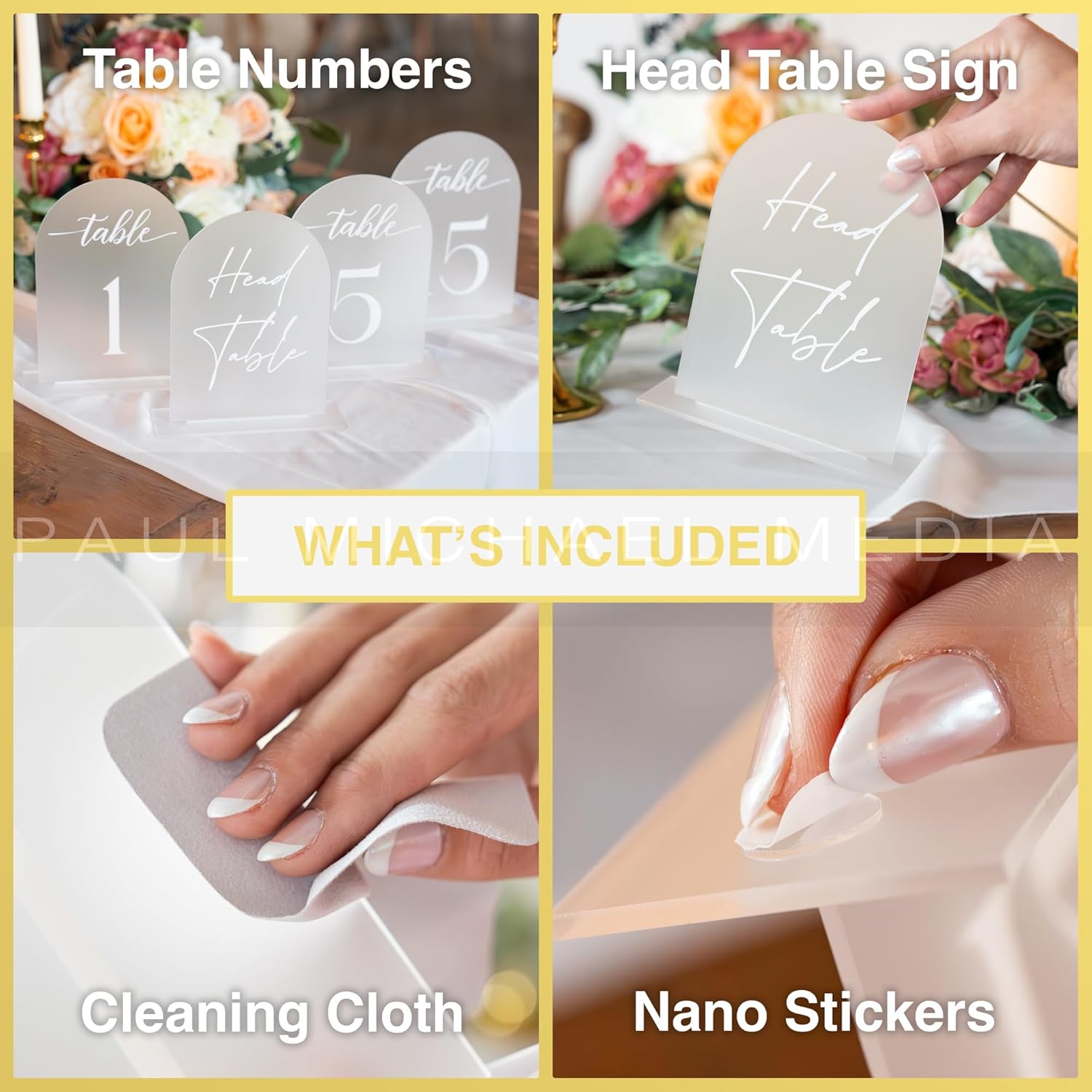 Frosted Arch Acrylic Table Numbers for Wedding Reception -20 Pack 5" x 7" White Font Table Number Centerpiece Set with Holder Stands & Head Table Sign - Anniversary, Event, Party, Wedding Table Numbers 1-20