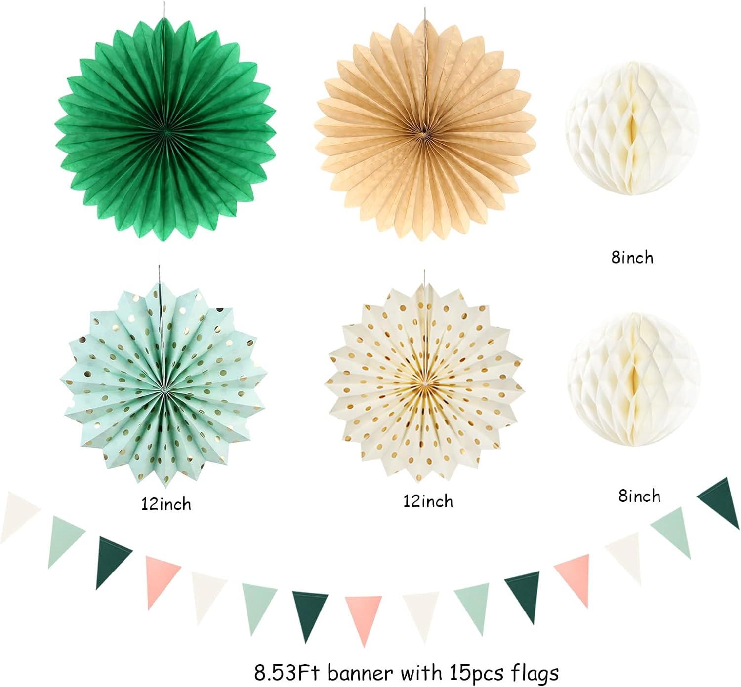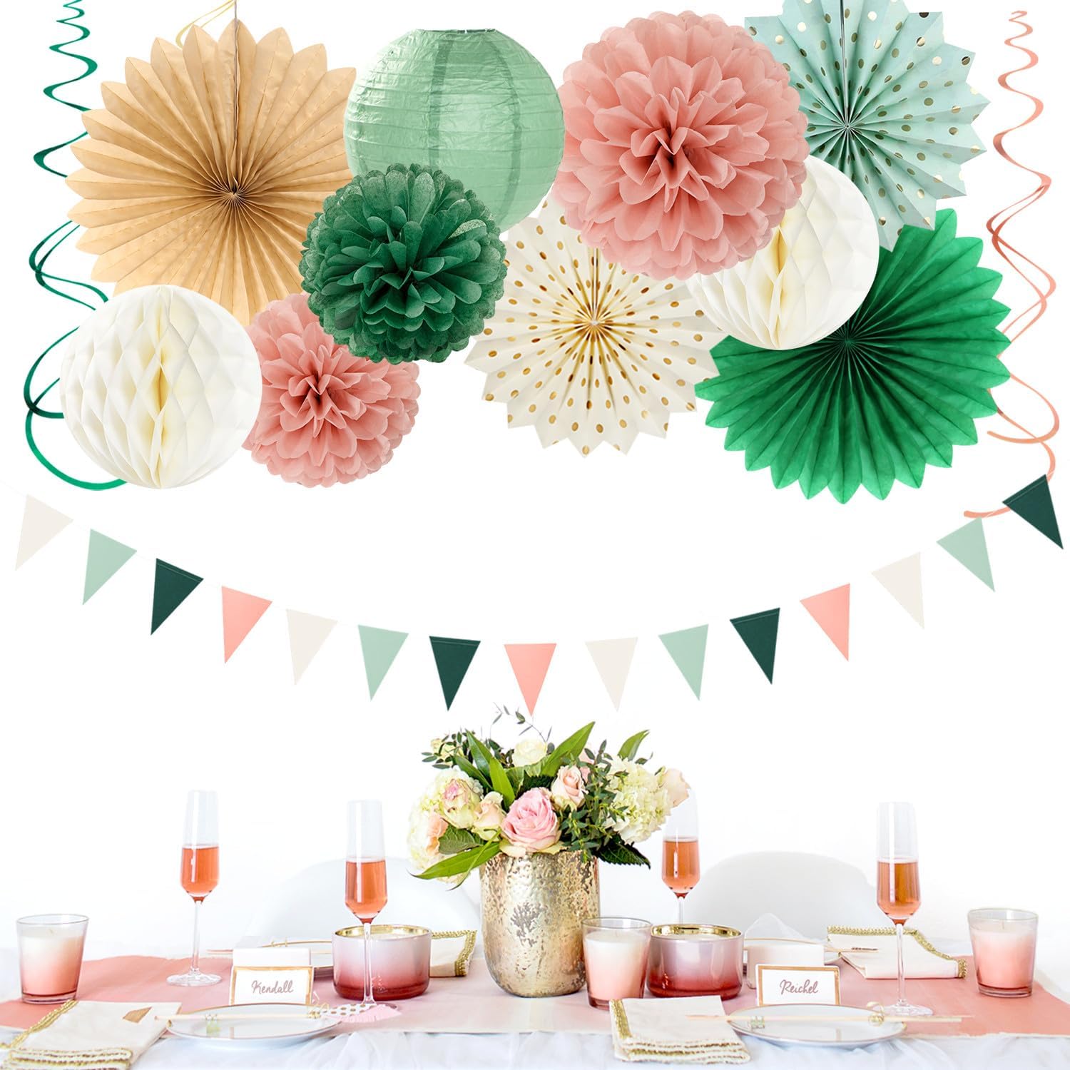 • 【Sage Green Pink Party Decorations Kit Includes】The party decorations kits include 9pcs tissue paper flowers: 3pcs 8" and 3pcs 10" and 3pcs 12" in sage green pink color, 4pcs 8inch paper lanterns,4pcs 12" paper fan,2pcs 8" paper homoneycomb and banner.