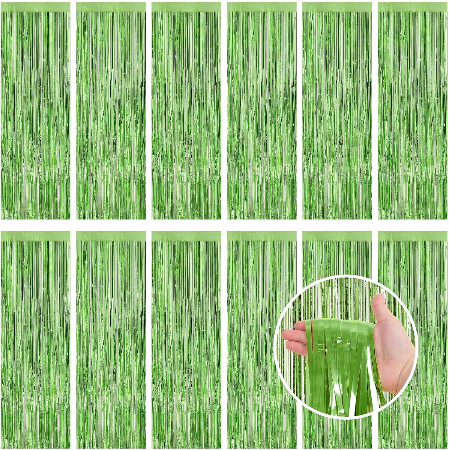 • 【Generous Quantity】Our party decoration supplies include 12 pieces of light green party streamers, the size of each light green foil curtain is 3.3ft x 8.2ft(1m x 2.5m). The extended length and rich quantity can help you create a sparkling party atmosphere and meet your various party decoration needs.