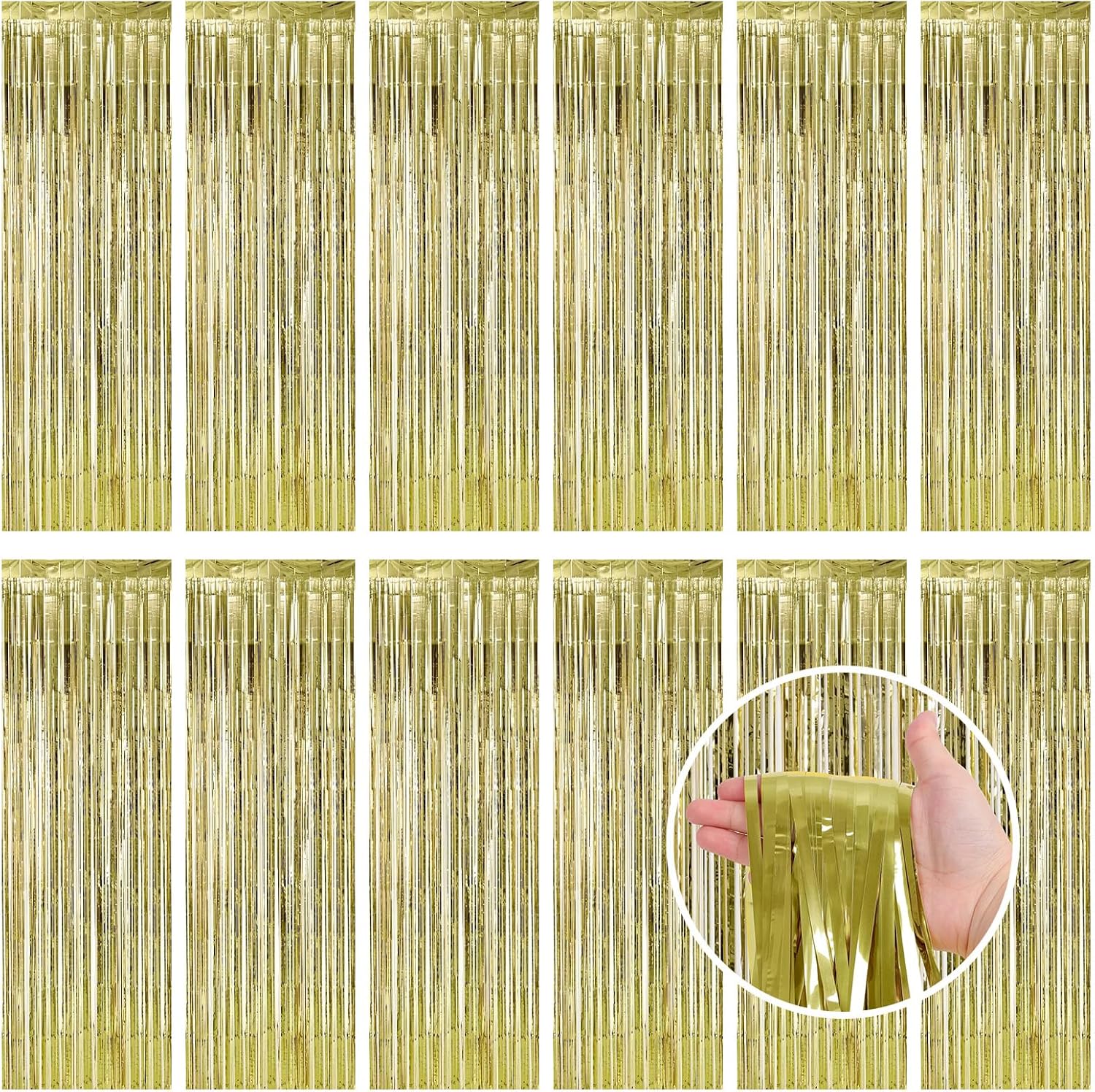 Light Gold Fringe Curtain Party Streamers, 12 Pack 3.3ft x 8.2 ft Foil Curtain Backdrop Tinsel Foil Fringe Curtains Photo Booth Backdrop Streamer for Birthday, Wedding, Baby Shower, Disco Party