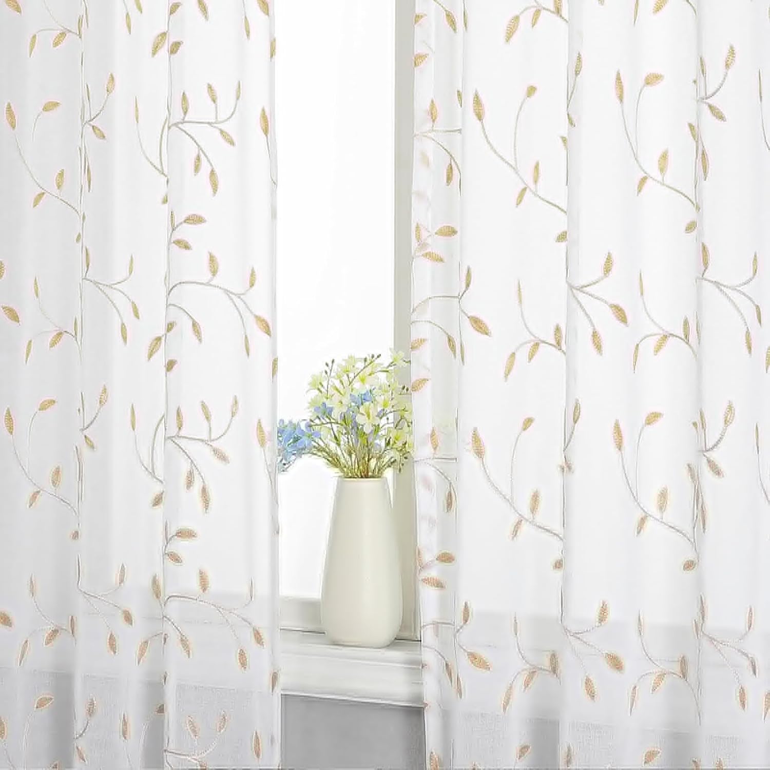 VISIONTEX White Sheer Voile Curtains, Decorative Orange Leaves Embroidery Faux Linen Rod Pocket Window Drapes for Home Kitchen, Living Room and Bedroom 54 x 108 Inch, Set of 2 Curtain Panels