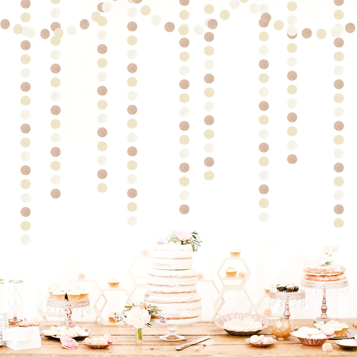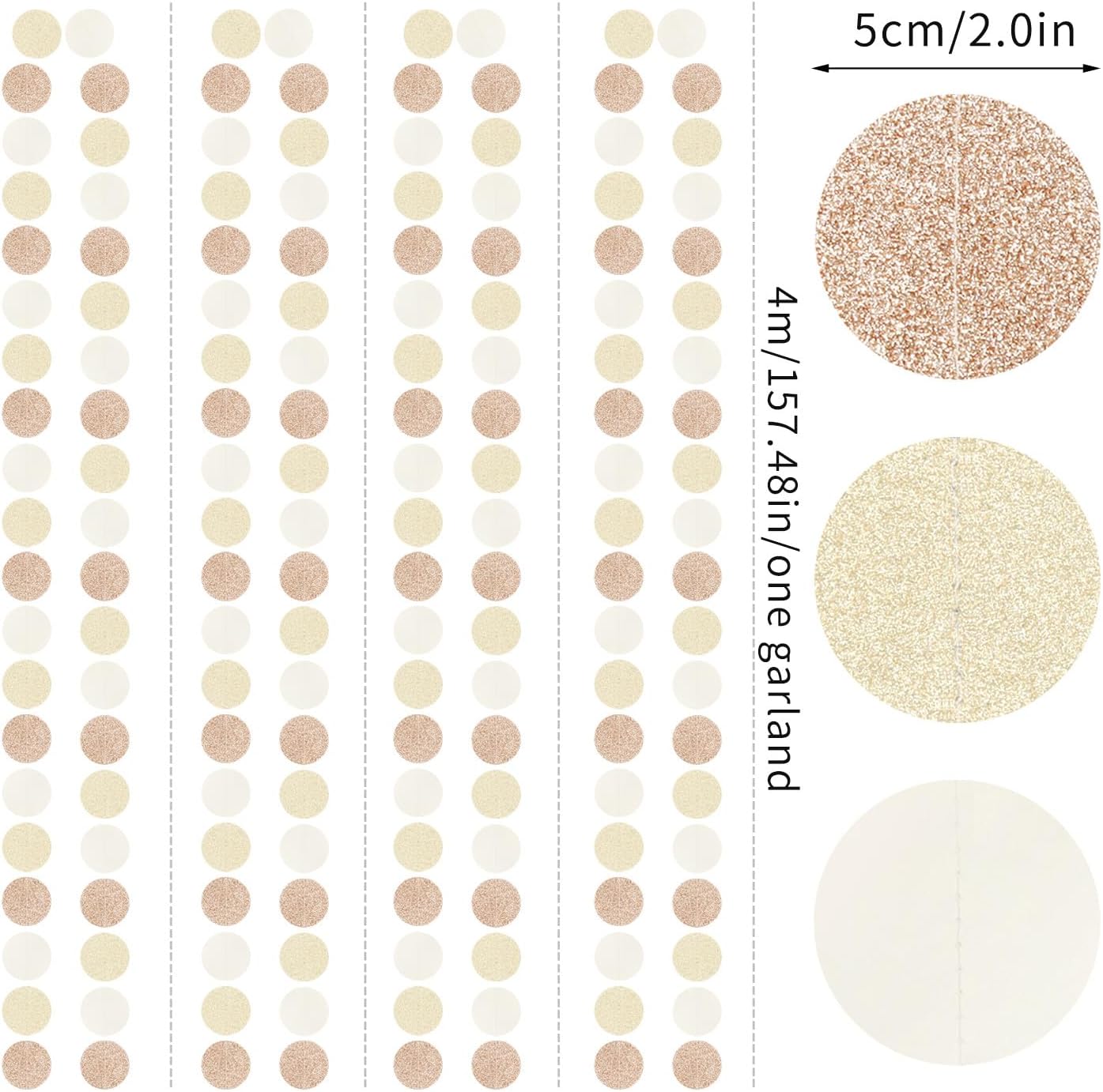• 【Champagne Gold Party Decorations Kit Includes】The party garlands includes 4pcs paper garlands, each backdrop bunting is 13 feet/ 4 meters long, total length is 52 feet/16 meters. Every Banner has 40pcs dots which the size is 2".