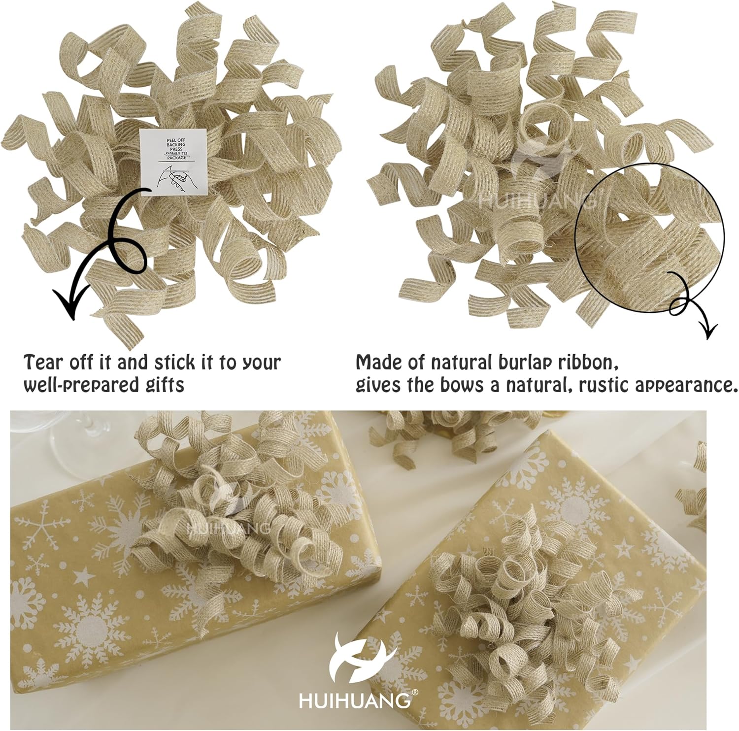 HUIHUANG Burlap Gift Bows Curly Bows for Gift Wrapping Self Adhesive Burst Gift Bow for Baby Shower, Wedding, Birthday Party Favors, Christmas Presents - 5 inch x 6 Counts