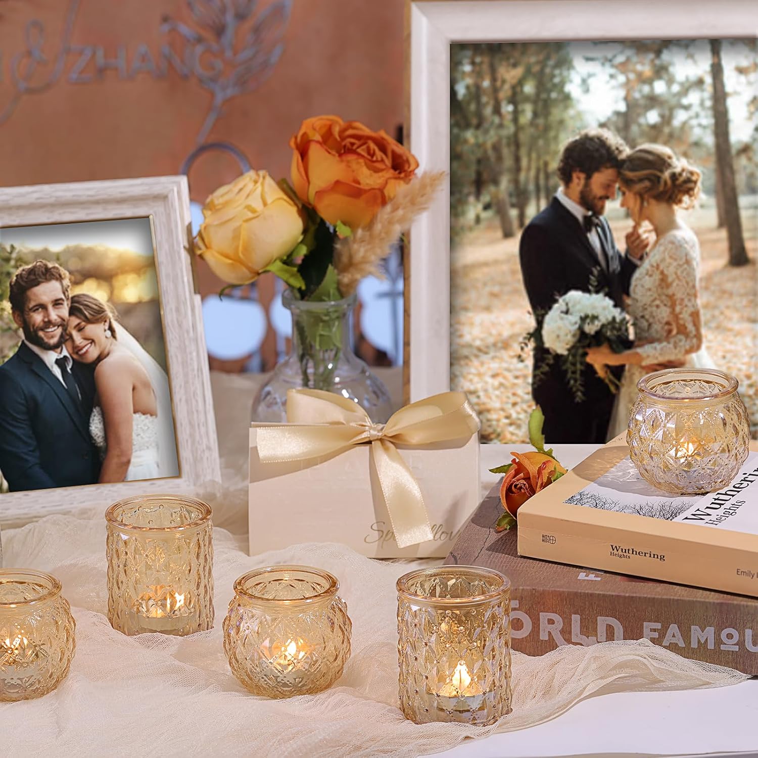 • Gold Votive Candle Holders: The glittering surface of the golden candlestick exudes exquisite and elegant. Its lustrous golden hue adds a touch of luxury to any space, casting a warm and inviting glow when a candle is lit within.
