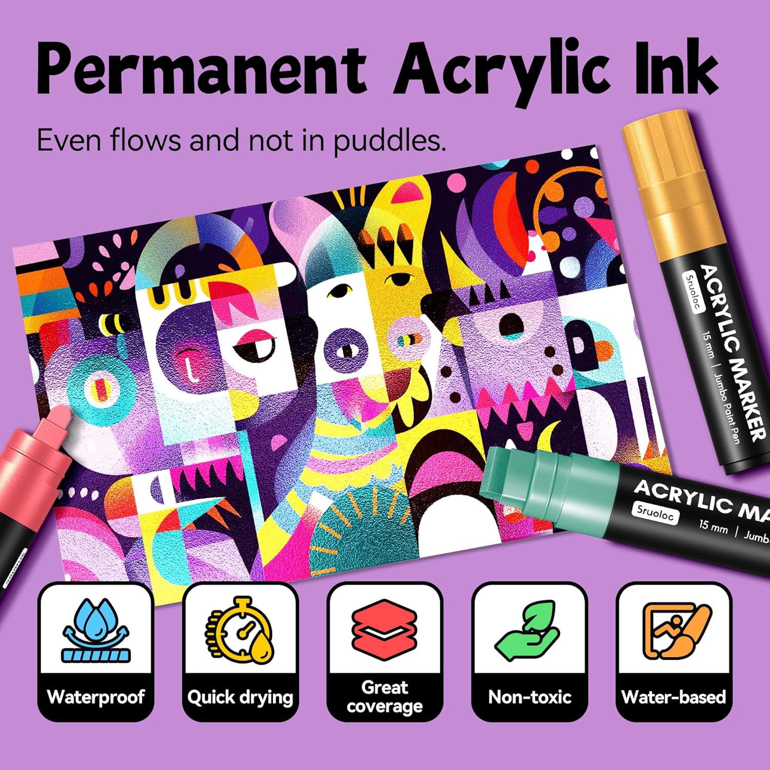 • Jumbo Markers Set: SRUOLOC jumbo markers are made with the highest quality water-based acrylic ink. That is waterproof, quick-drying, permanent , and smooth flow