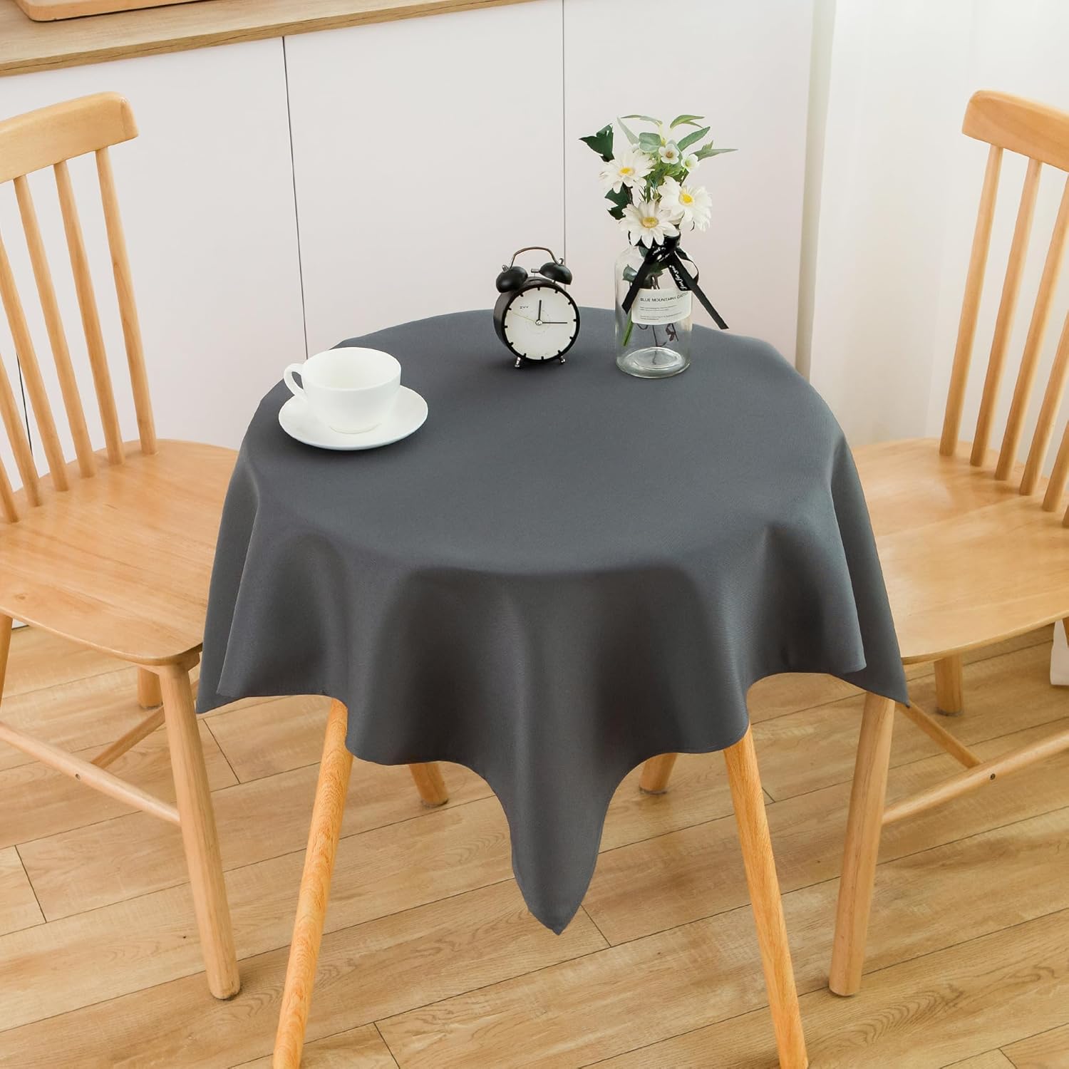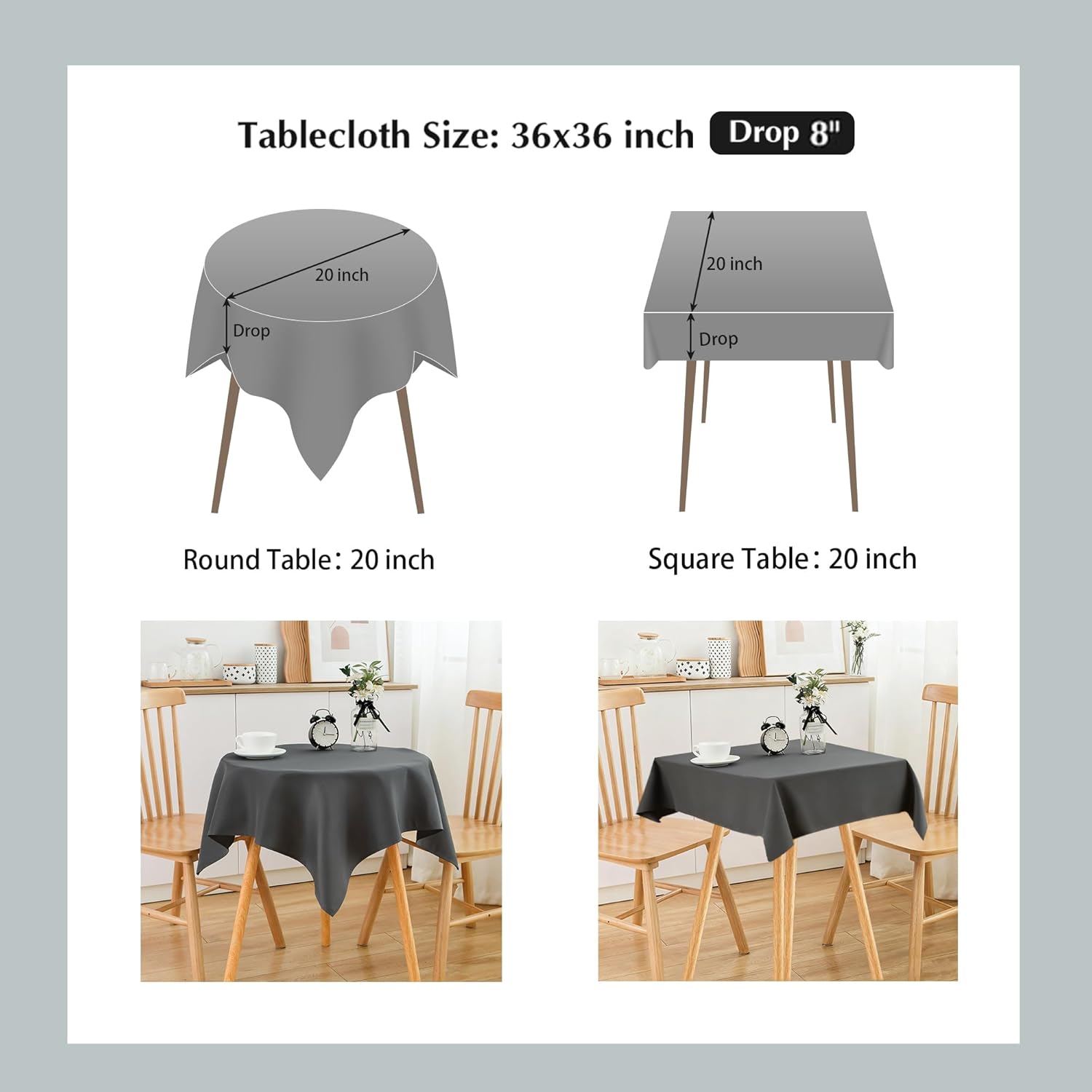 • Size Guide: Each package contains 2 PCS tablecloths. Each small square grey tablecloth is 36X36 inches, recommended for small square tables from 20 X 20 inches to 28 X 28 inches, such as end tables, coffee tables, tea tables, beside tables, foldable tables, nightstands, flower stands and so on, with a droop length about 4 inches to 8 inches. There may be a slight deviation due to manual tailoring