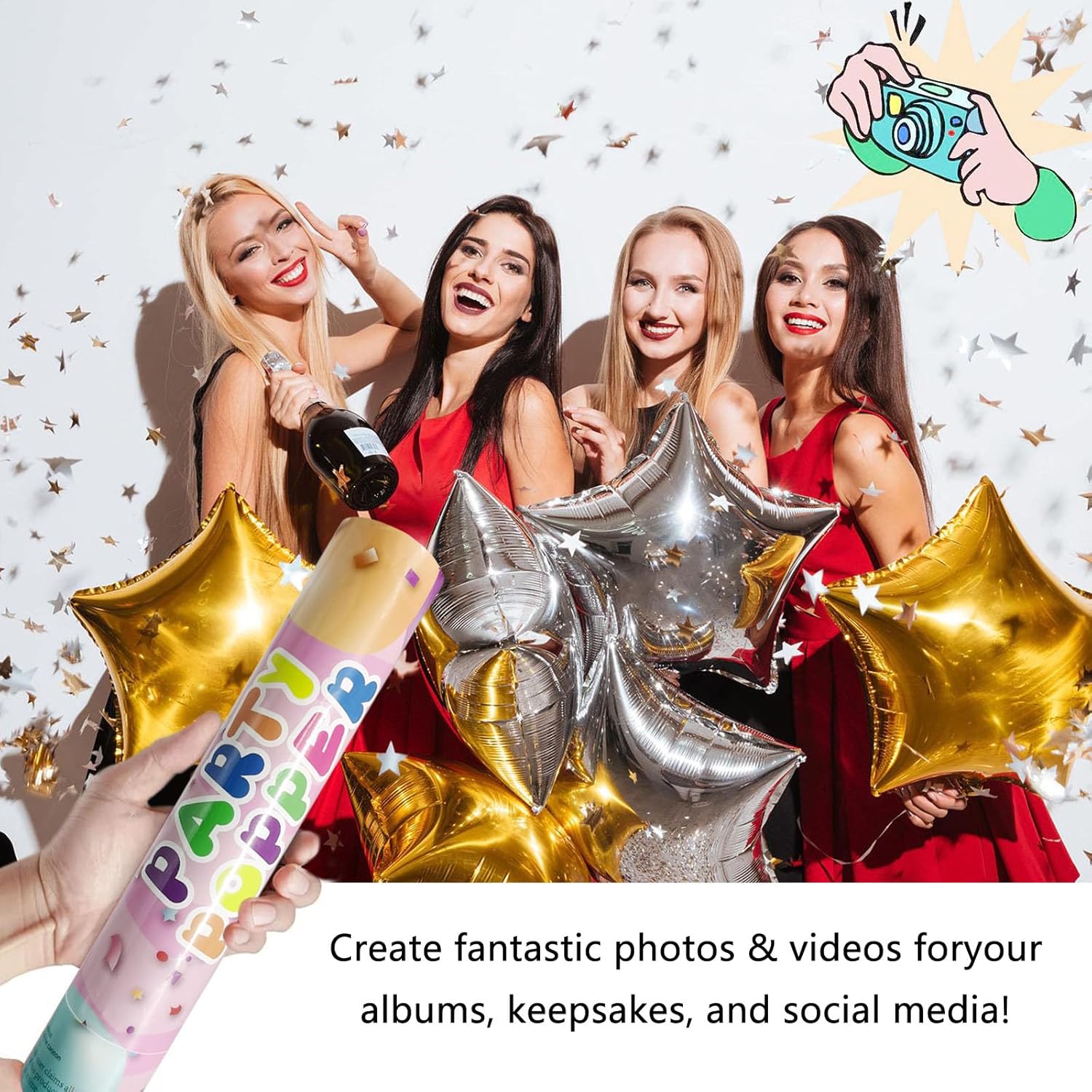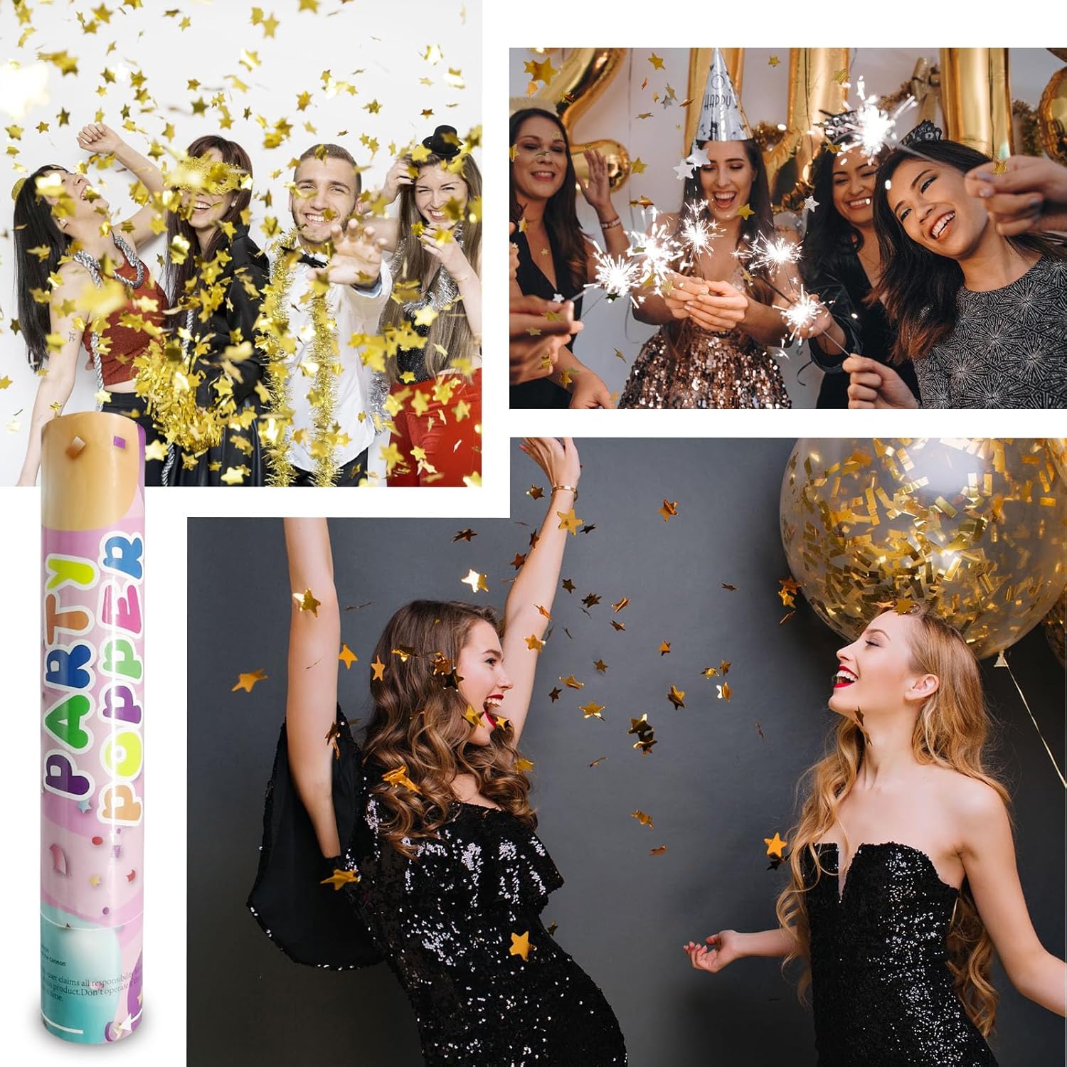 • 【Gold&Silver Star Confetti Poppers】The use of gold&silver star confetti cannons is a vibrant and festive addition to various occasions. From weddings, birthdays, and Christams to corporate events and celebrations, they add a touch of color and excitement. The sudden burst of lips paper shards creates a joyful atmosphere, surprising and delighting guests. Whether indoors or outdoors, confetti cannons are a safe and effective way to make any special day even more memorable.
