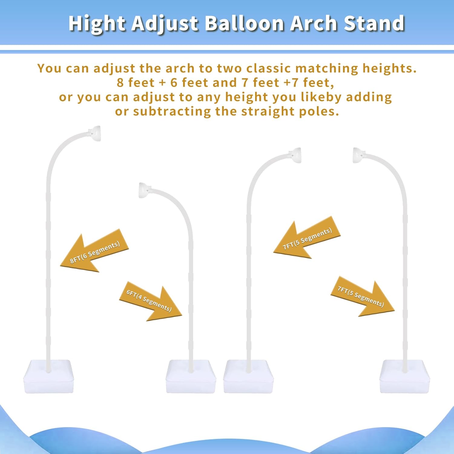 • 【Flexible and Customizable】Unlike traditional round or square arches, our high plasticity tubes can be twisted and bent to create unique shapes such as circles, semi-circles, hearts, S-shapes, and balloon pillars. The top bendable poles can be adjusted to the shape you desire. You can adjust the arch to two heights: 8 FT + 6 FT and 7 FT + 7 FT, or to any height you like by adding or subtracting straight tubes, making it the highlight of any party.