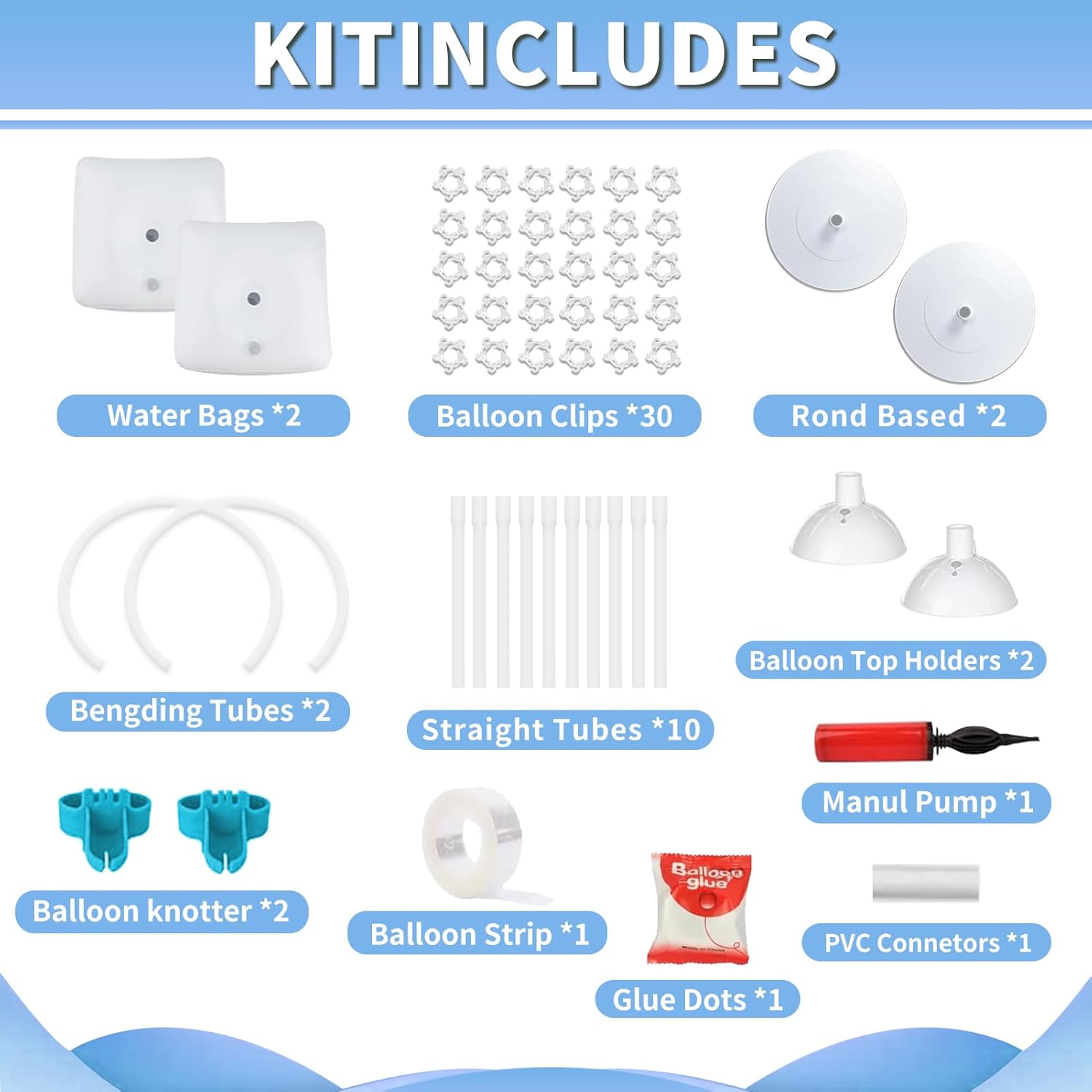 • 【All-in-One Kit】Our balloon arch kit includes everything you need: 10 straight poles, 2 bendable top poles, 2 round bases, 2 water/sand bags, 30 balloon clips, 2 balloon top supports, 2 balloon knotters, 1 roll of glue dots, 1 balloon arch strip, 1 PVC connector, 1 manual pump, and detailed instructions.