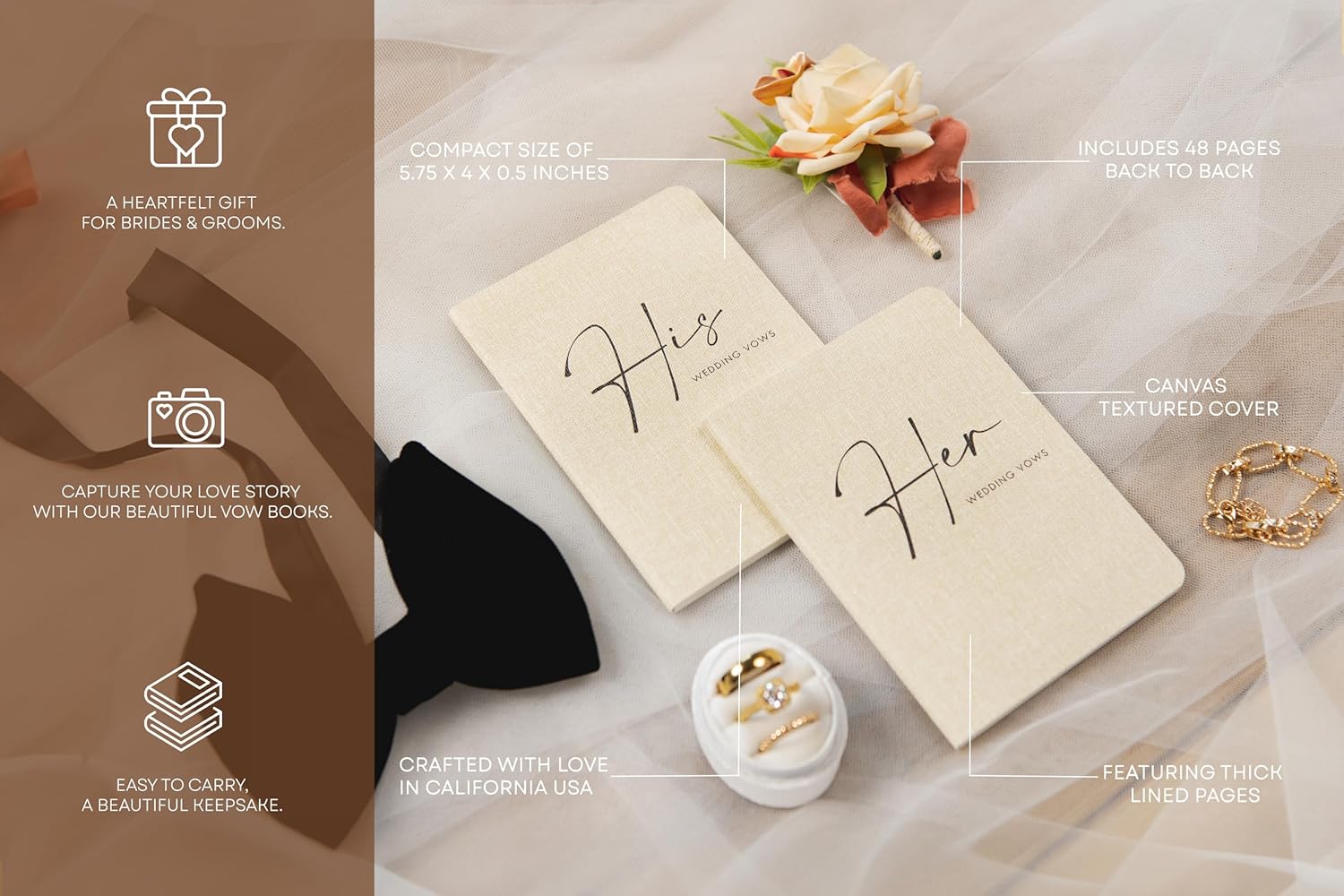 • Our vow books serve the primary purpose of helping you capture and preserve your wedding vows in a dedicated and elegant format. Whether you are writing 'his vows' or 'her vows,' these booklets offer a cherished space for your thoughts and promises, making them an invaluable keepsake. Perfect for wedding ceremonies, vow renewals, or as a heartfelt gift for your fiancé, these vow books add a personal touch to your wedding journal.