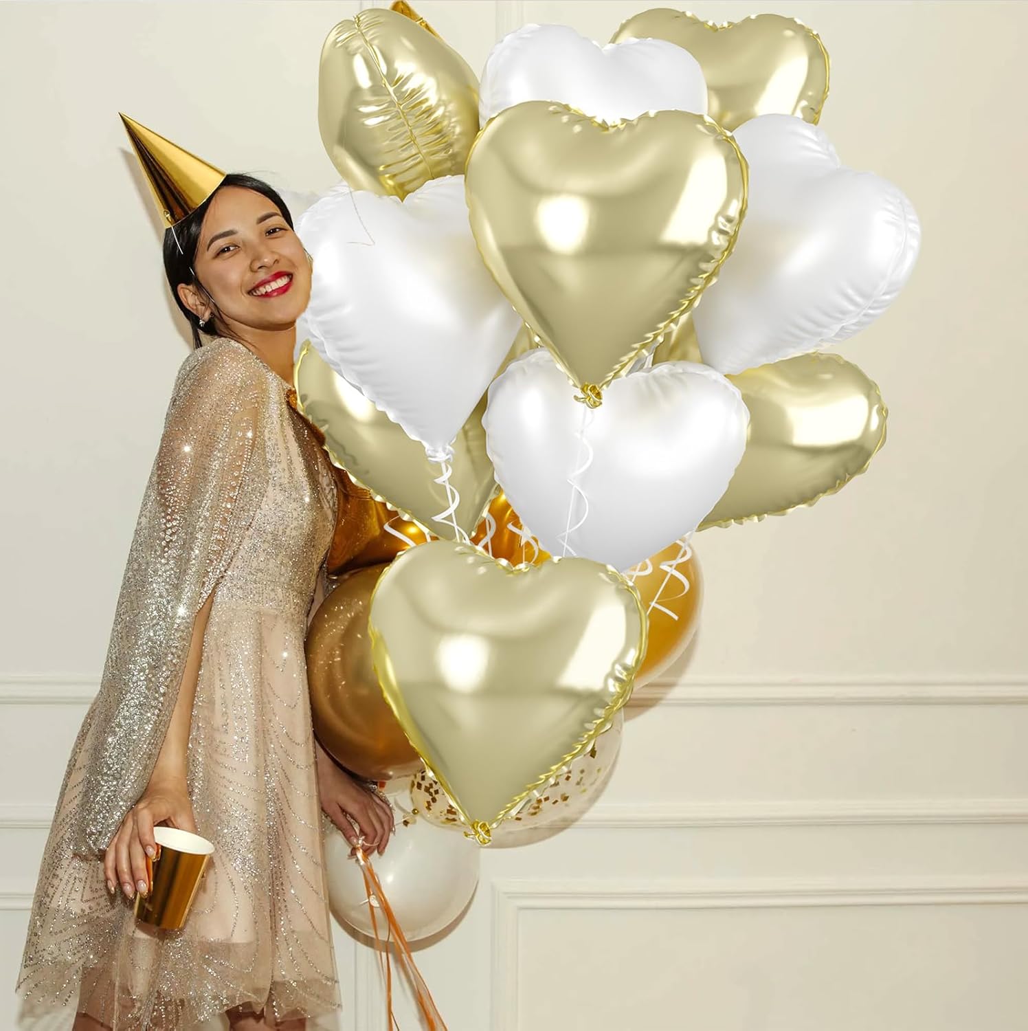 • 10 PCS White Gold Heart Balloons: Our package contains 5 x 18 inches gold heart shaped balloons, 5 x 18 inches white heart shaped balloons, 1 x 10m ribbon. The light gold and white foil heart balloons are specially designed to add a touch of fun and surprise to any party or holiday celebration. With a size of 18 inches, they are the perfect addition to your decorating needs, leaving your guests with an unforgettable smile!