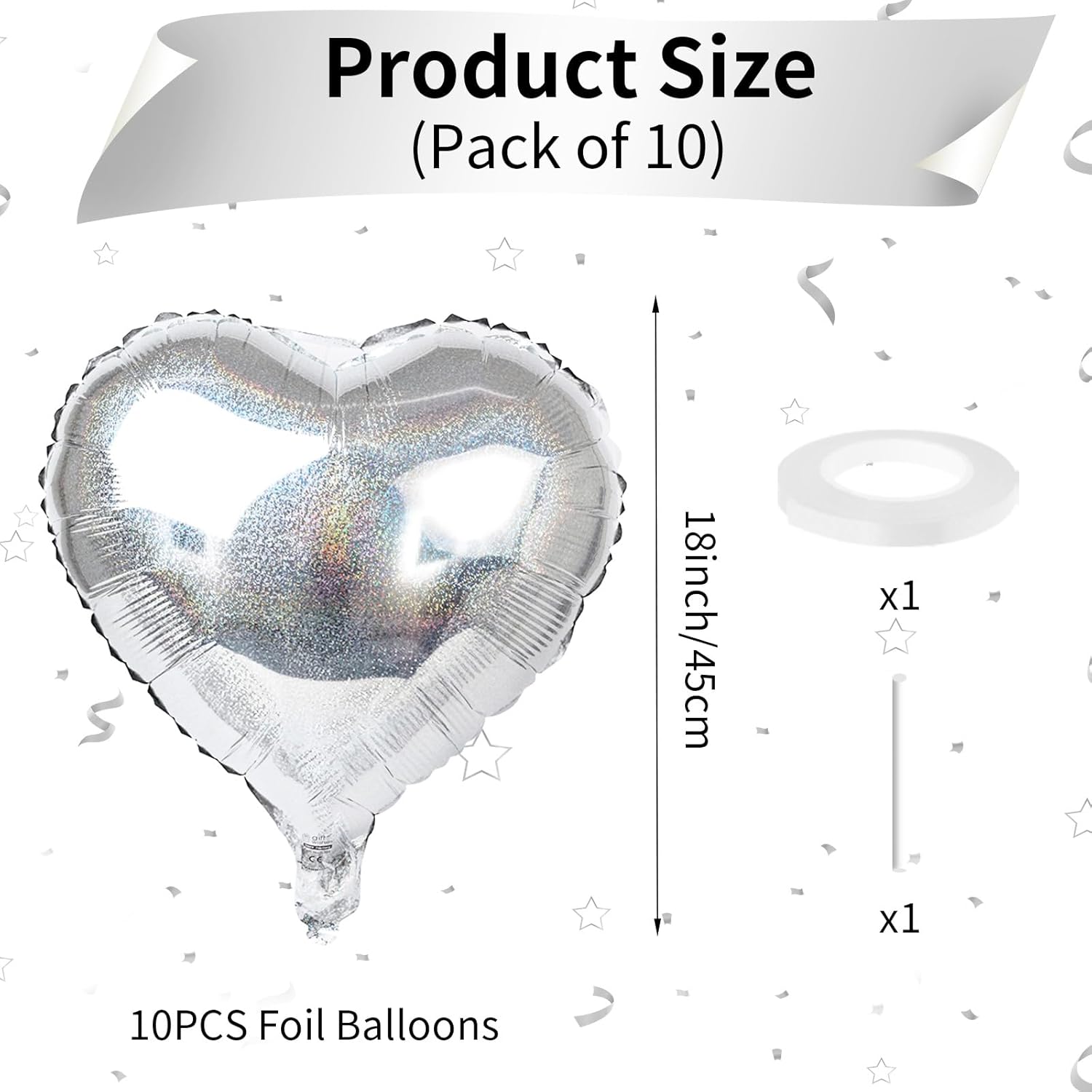 • 10 PCS Silver Heart Balloons: Our package contains 10 x 18 inches glitter silver heart shaped balloons, 1 x 10m ribbon. The silver foil heart balloons are specially designed to add a touch of fun and surprise to any party or holiday celebration. With a size of 18 inches, they are the perfect addition to your decorating needs, leaving your guests with an unforgettable smile!