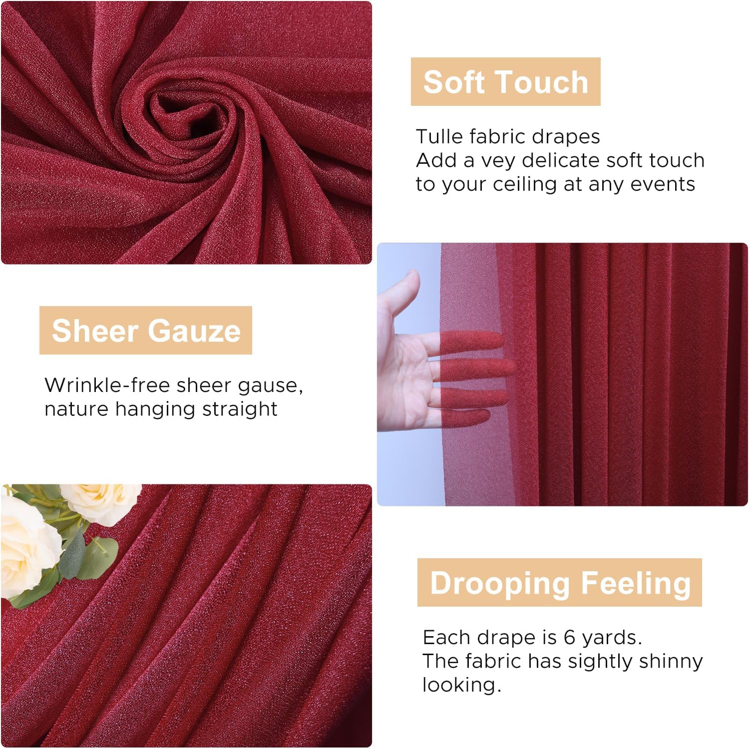 • 【Soft Wedding Drapes】Sheer drapes for wedding arch decor are made of polyester fabric, touch silky soft. These arch draping fabric is lightweight, easy to hang vertically with natural sagging, wrinkle-free, durable and reusable.