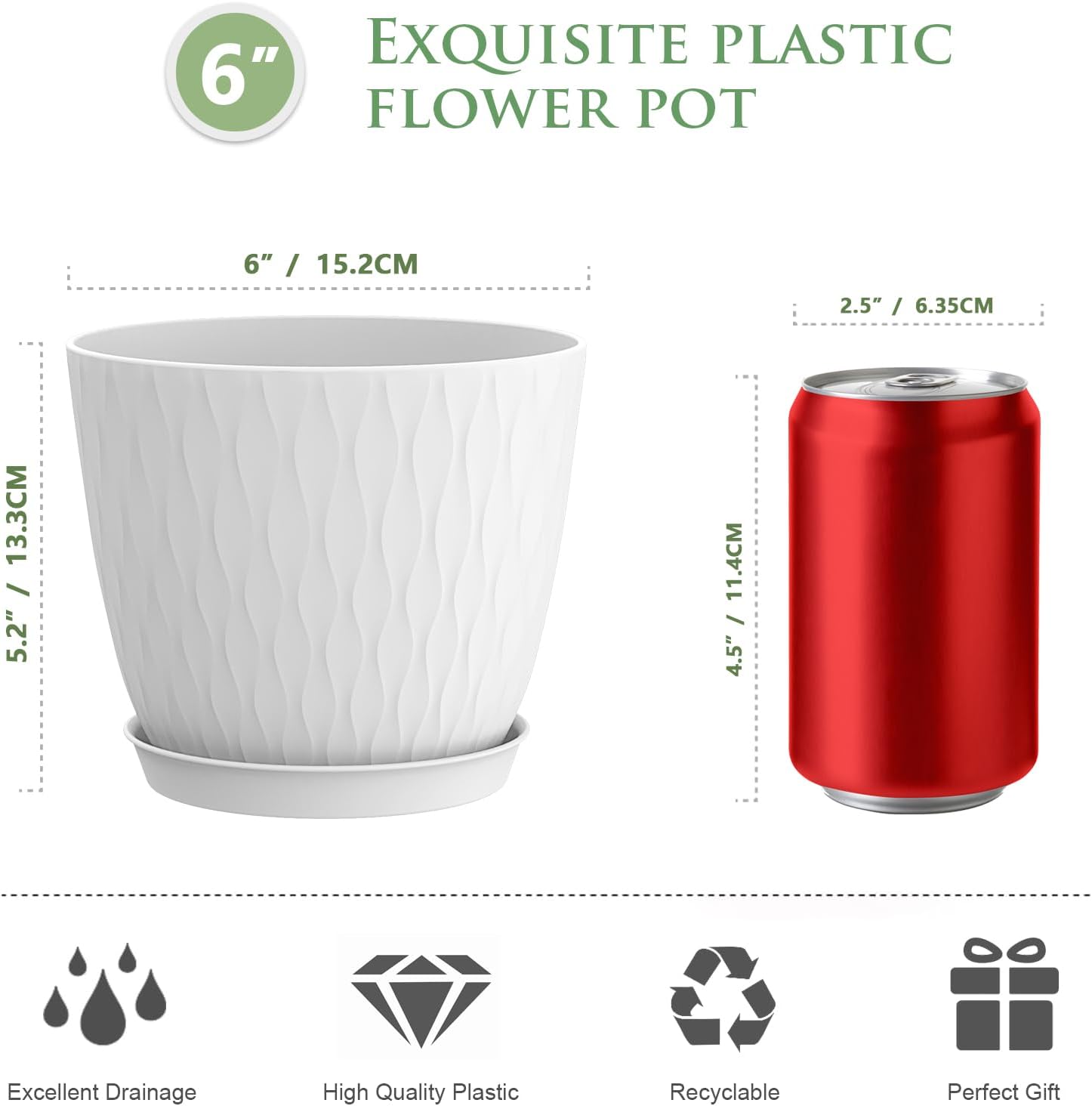 6 inch Flower Pots, 5 Pack Plant Pots with Drainage Holes and Saucers for Indoor Plants, Plastic Planters with Water Ripple for Small Garden House Plants, Nursery Pots for Succulent, White