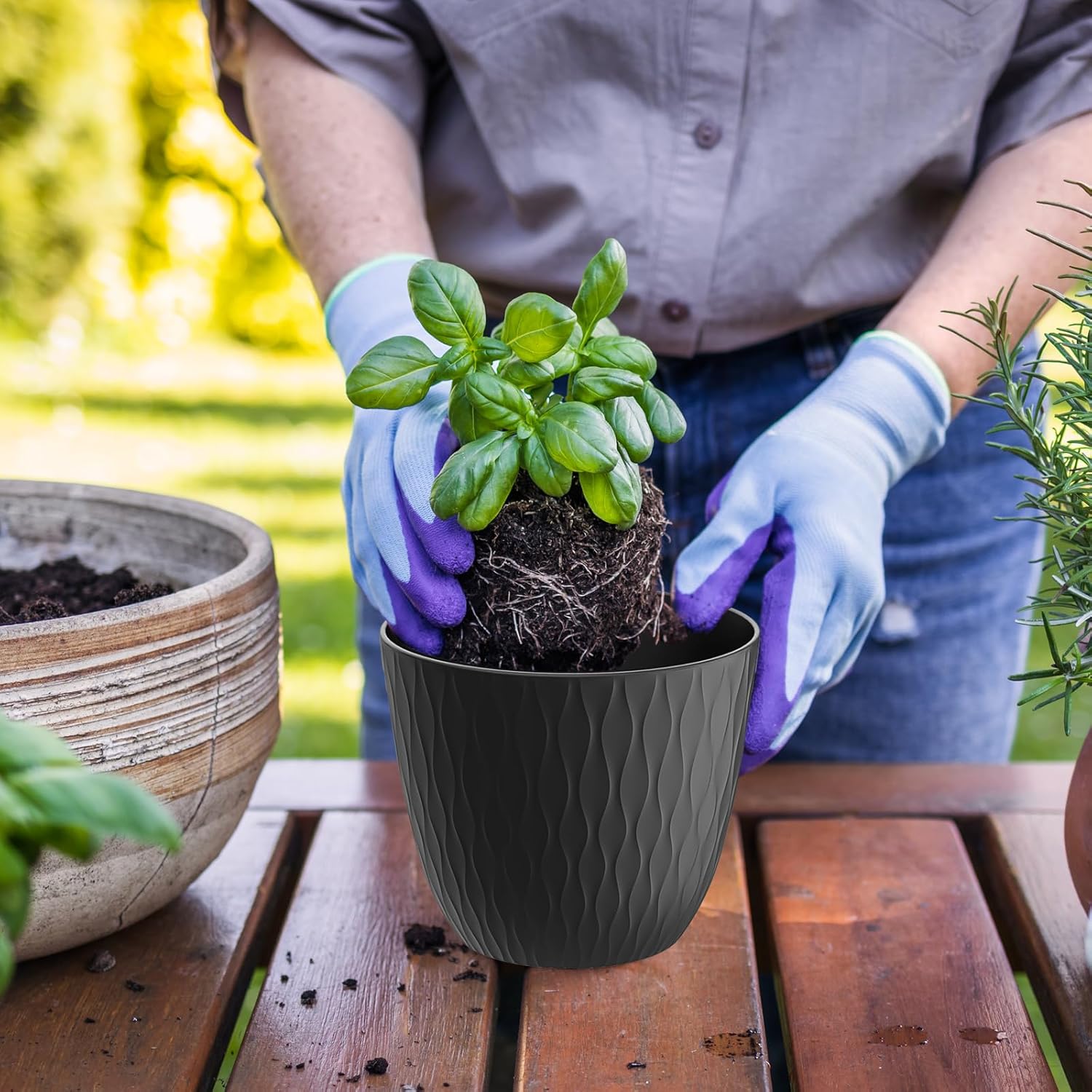 6 inch Plant Pots, 5 Pack Flower Pots with Drainage Holes and Saucers for Indoor Plants, Plastic Planters with Water Ripple for Small Garden House Plants, Nursery Pots for Succulent, Black