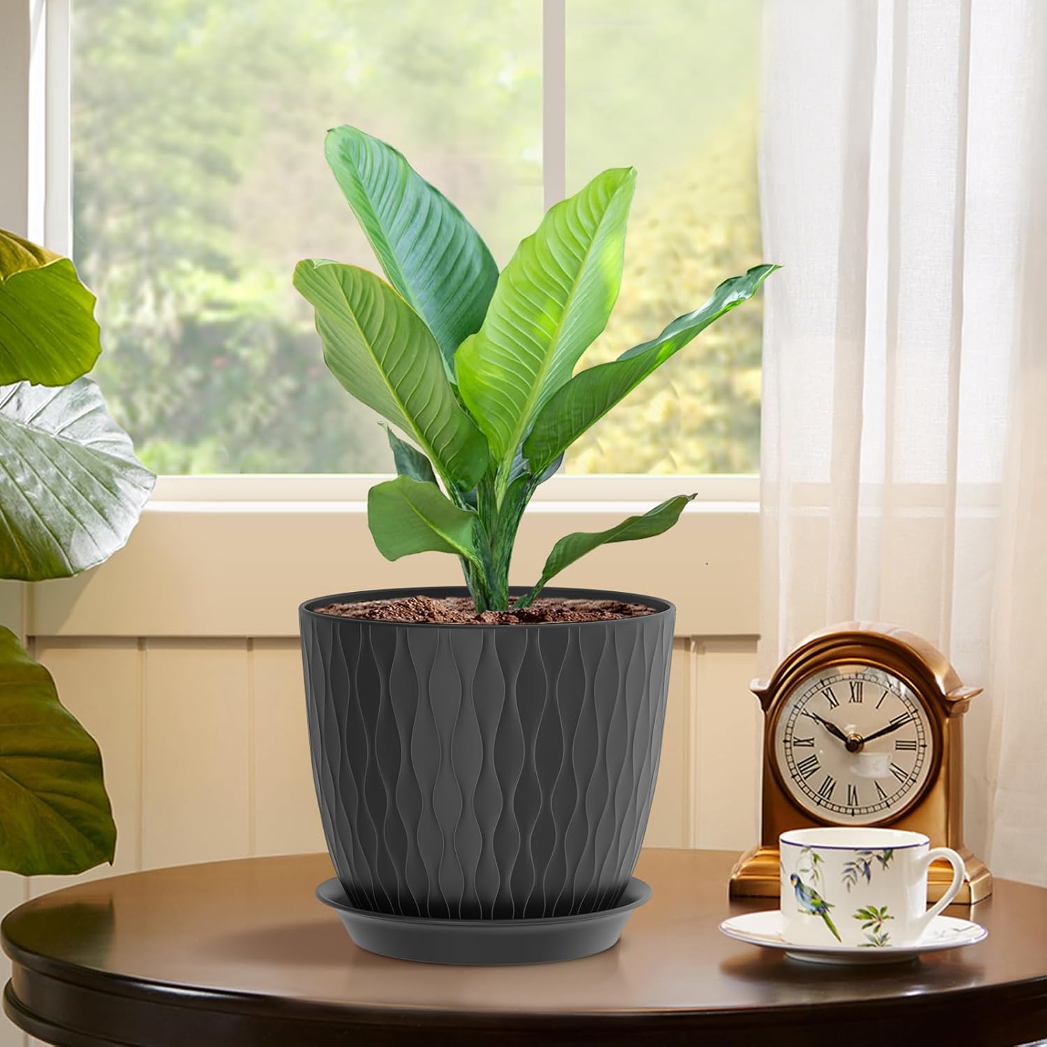 7 inch Plant Pots, 5 Pack Flower Pots with Drainage Holes and Saucers for Indoor Plants, Plastic Planters with Water Ripple for Small Garden House Plants, Nursery Pots for Succulent, Black