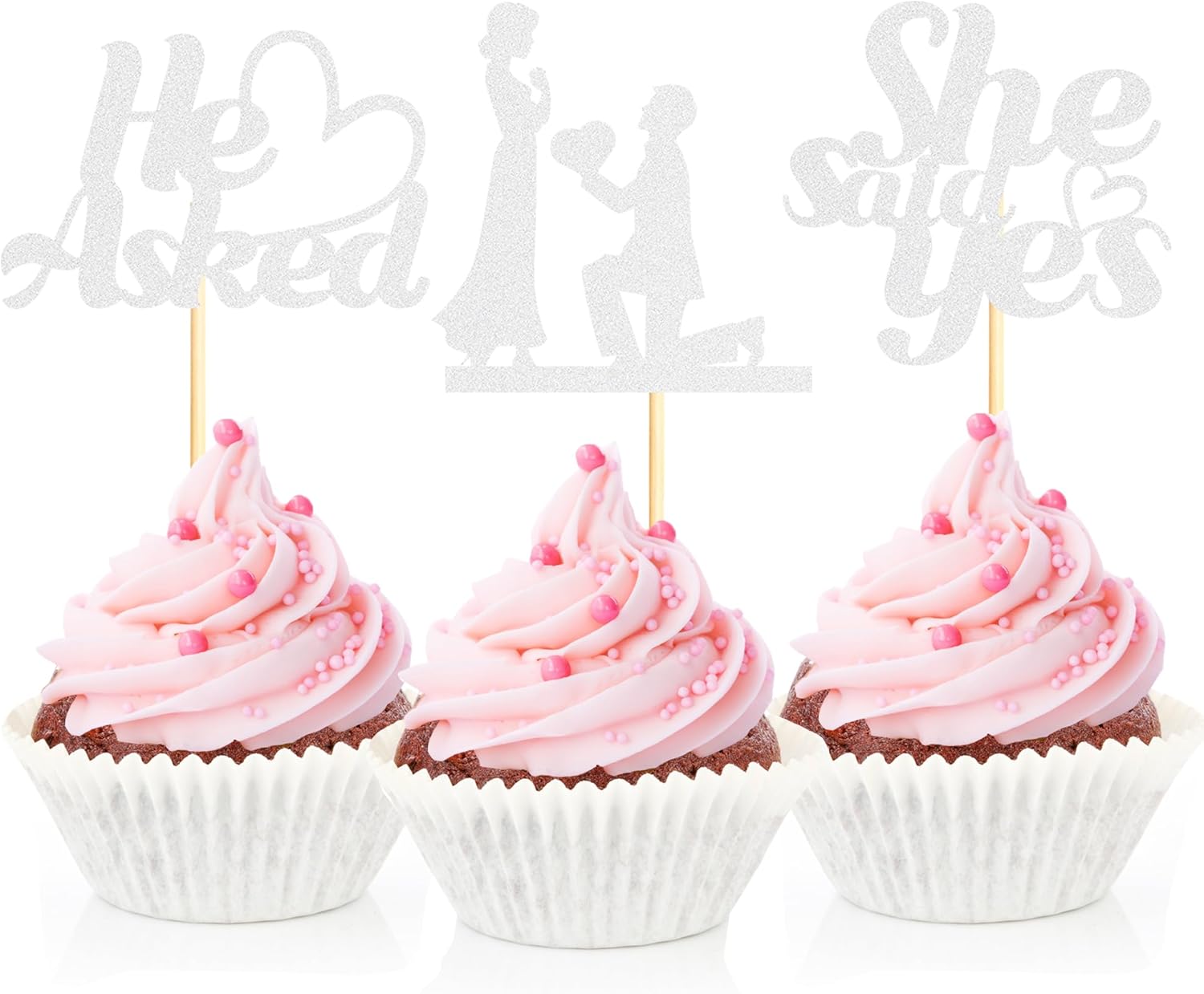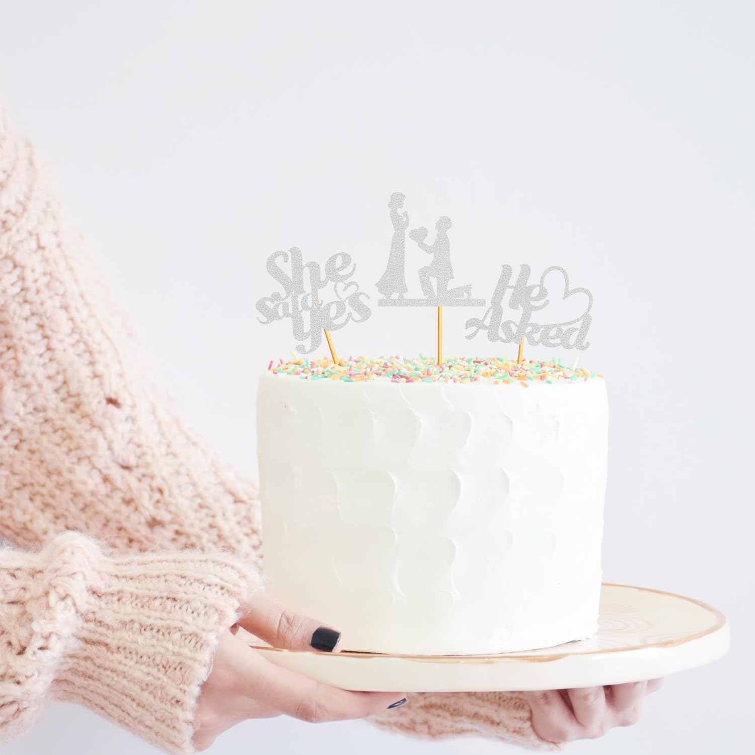 • Package Included: 3PCS Silver Glitter He Asked She Said Yes Cupcake Toppers add "propose"sign. Already assembled so you can insert into wedding engagement party decoration, which make your cake icing on the cake. Size: W 2.3 inch * H 4.72 inch / W 6 cm * H 12 cm(Including Stick)