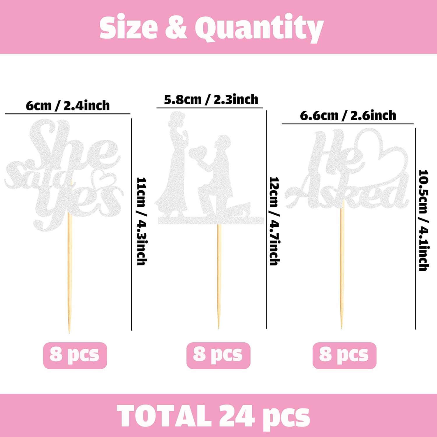 • Unique Design: This silver 24PCS He Asked She Said Yes Cupcake Toppers to make your Wedding Engagement party stand out! The delicate design like your a match made in heaven makes your dessert look more romantic. Shimmering glitterscreate a lovely and sweet feel for your wedding party
