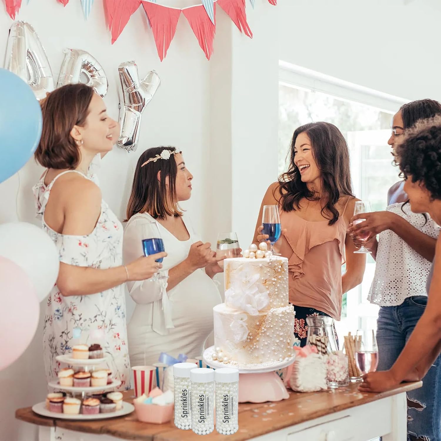 • 【Easy to use】: These white ball sprinkles can be used in many ways, for example, you can directly sprinkle them on food in large quantities, which is amazing and easy to use. You also can choose some parts of the sprinkles to decorate, as the icing for the dessert. These edible candy pearl sprinkles are nice decoration such as winter Christmas white themed birthday party, baby shower, wedding,bridal showers, anniversary, engagement etc.