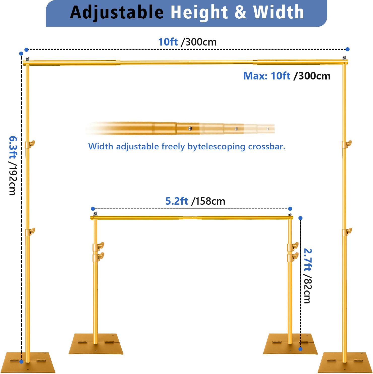 • [2 x Support Sand-Titanium Gold]The stand is made of high-quality aluminum alloy, Height is adjustable from 2.7 ft to 6.5 ft. [2 x Titanium Cross Bar-Gold] Adjustable width (Min 5.2 ft to Max 10 ft), easy to connect, telescoping top crossbar,Max Load Capacity 26 lbs, Super durable and heavy ,Safely use.