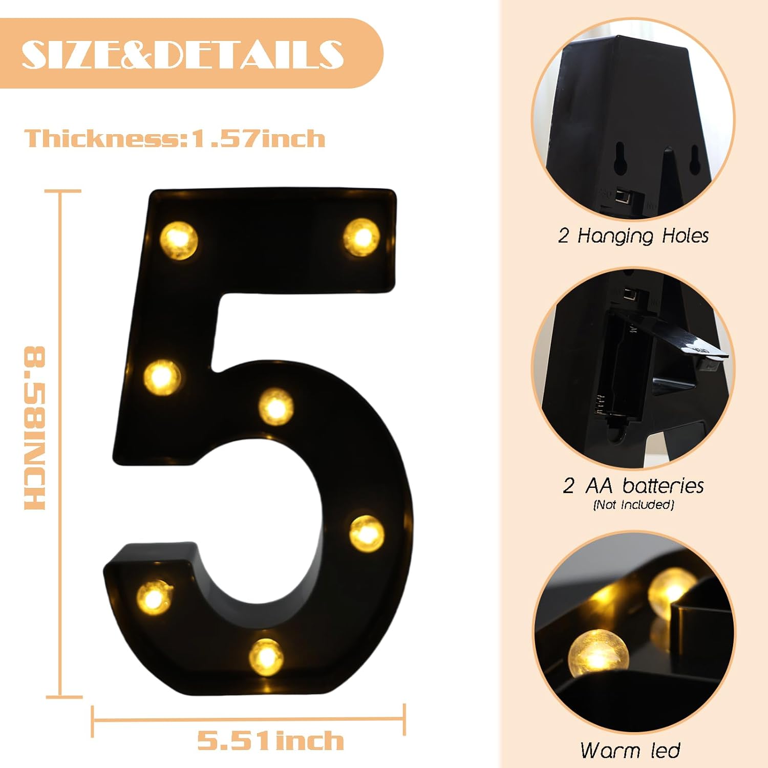 LED Marquee Numbers, 8.58 Inch Led Light Up Numbers for Party, Small Light Up Letters, Battery Powered Lighted Number for Table, Birthday, Night Light, Christmas or Home Decor (Black, Number 5)
