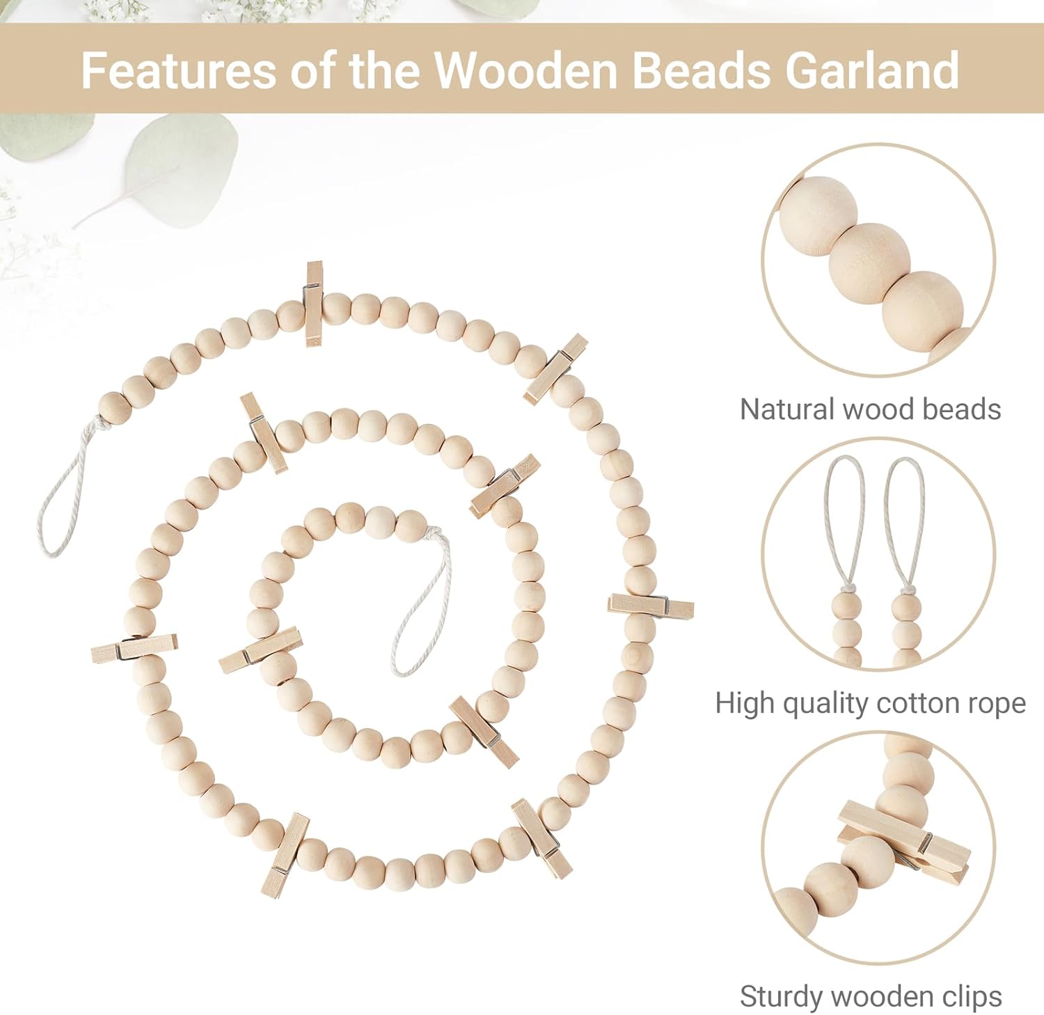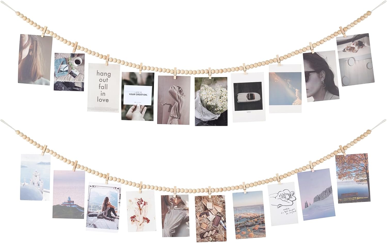 • Size and Package: The total length of the whole garland is 51.2 inches, with a wood bead chain length of 47 inches. Each garland includes 10 clips, with 8 wooden beads spaced between each wooden clip. This set includes 2 pieces, catering to your various needs for picture display and home decor. Note: This is a handmade item, the length of the garland may has 1-2 inches deviation.