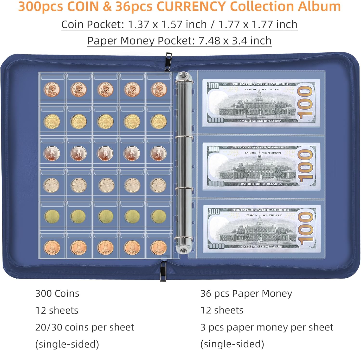 Coin Collection Book Holder for Collectors, 300 Pockets Fireproof Coins Collecting Album & 36 Sleeves Money Storage Case for Coin Currency Collection Supplies, Bill, Pennies, Quarters, Stamp,Blue