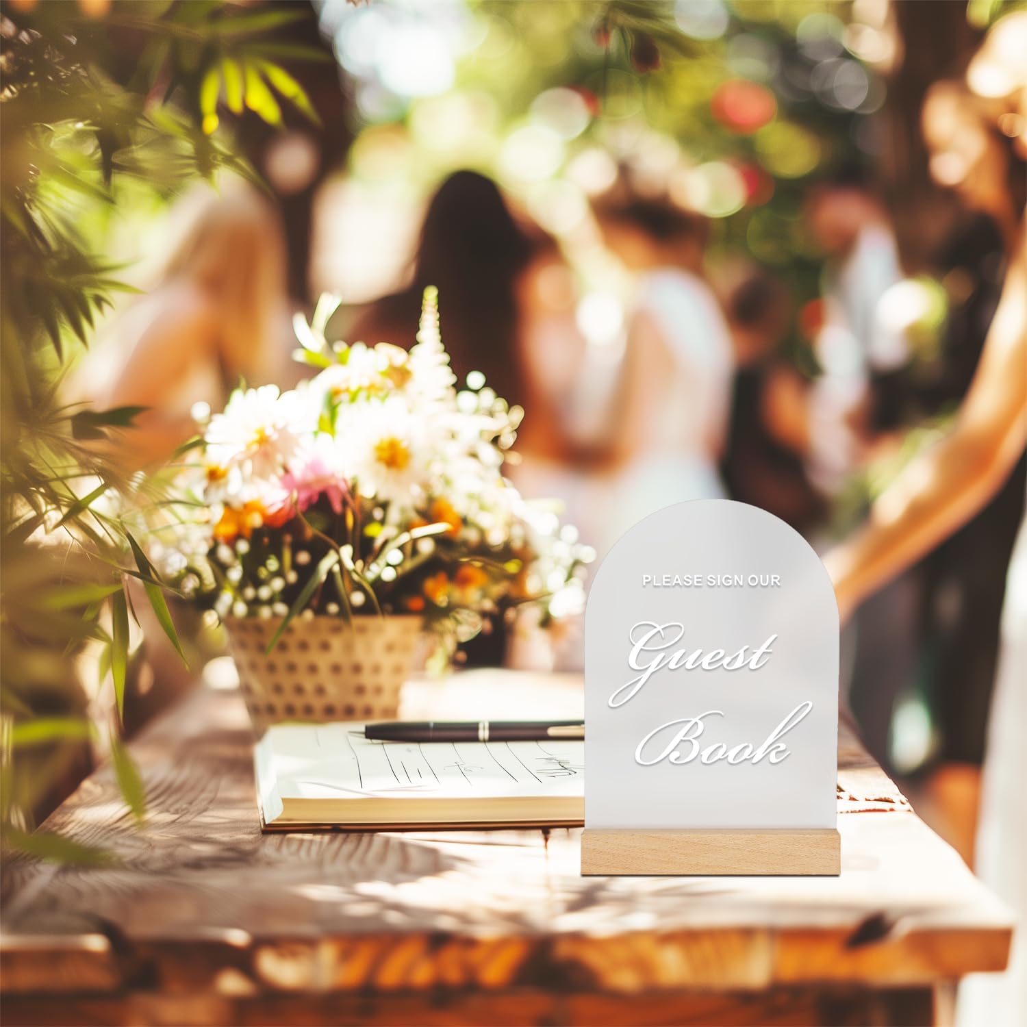 • Premium Materials: Our acrylic wedding sign features 1/8-inch thick frosted acrylic, ensuring durability. It includes a 5x7 inch guest book table sign, a cards and gifts table sign, a Favors sign, an In Loving Memory sign, and 4 sturdy wood stands made from German beech wood, ensuring stable support and durability. The white text is UV printed, ensuring clarity and durability. Ideal for use as both wedding decor and keepsakes, they can be reused for future events.