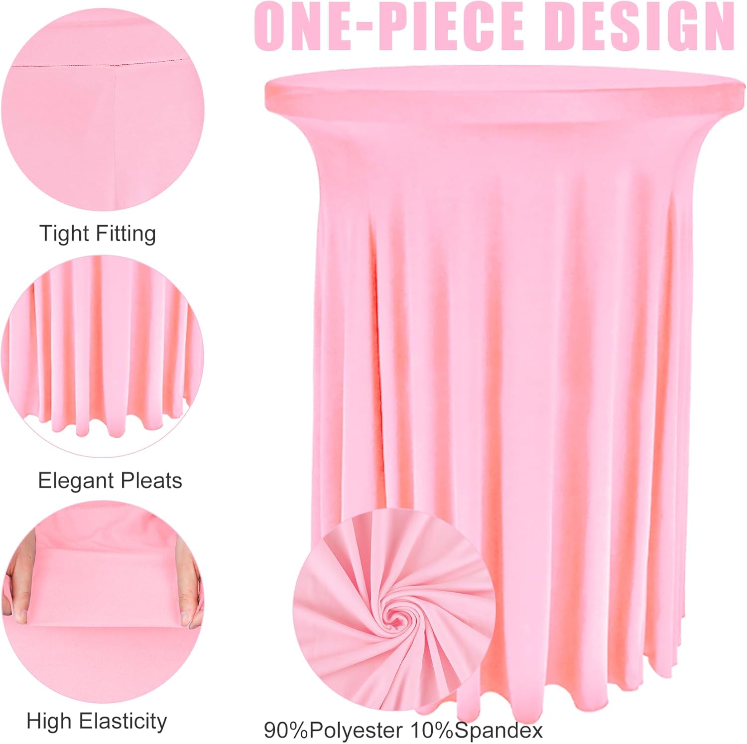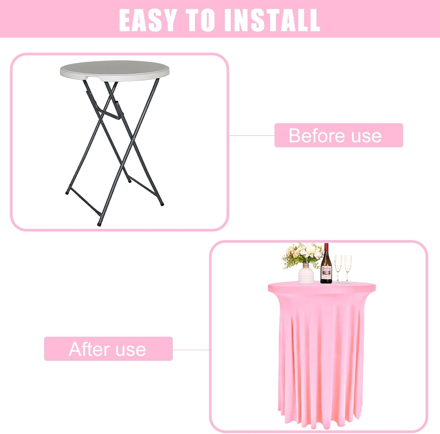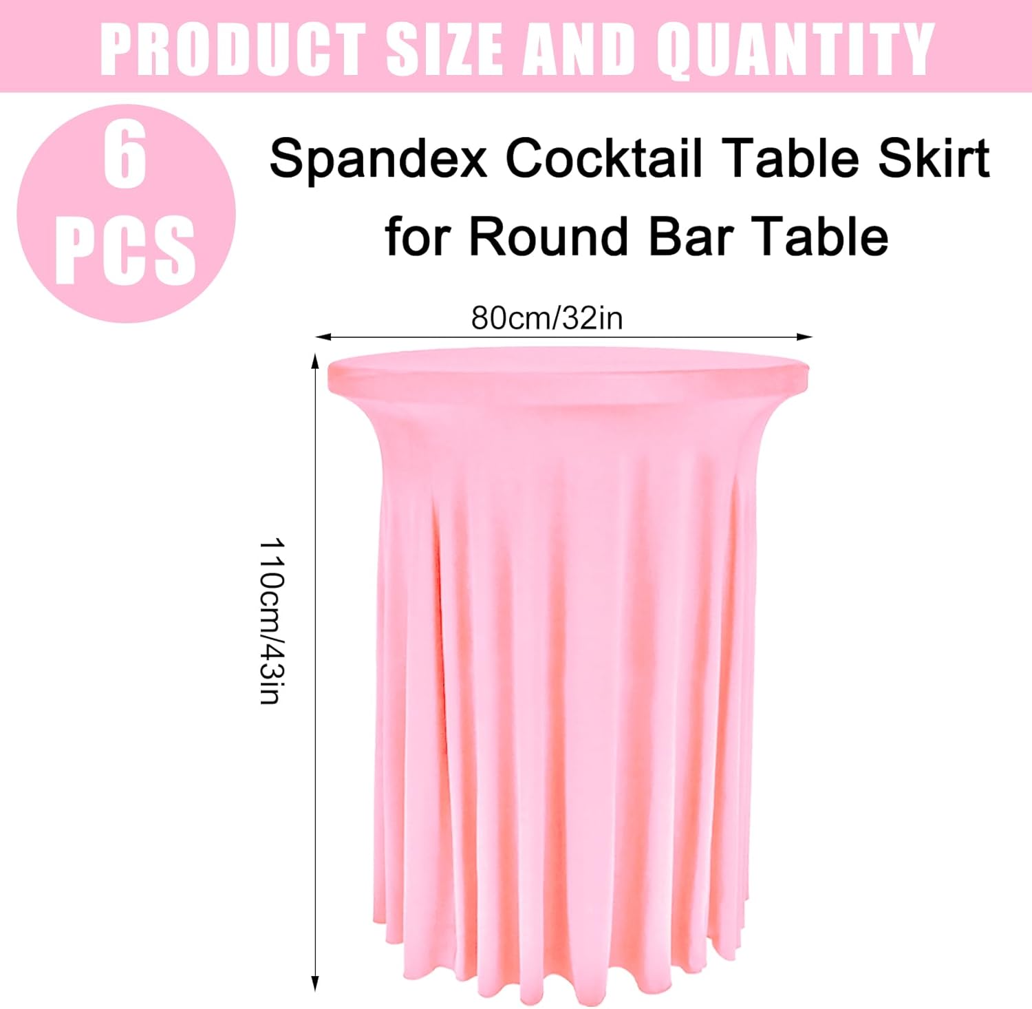 • Package Include: you will get 6 pieces 32 x 43 inch cocktail spandex table skirt in pink color, which fits for high top round tables (Size: 32 inches diameter by 43 inches height), enough quantity for you to decorate your party or rooms. You can also tie a bow or other decorations to make the round cocktail table covers look more special and elegant, which can add atmosphere to your party.