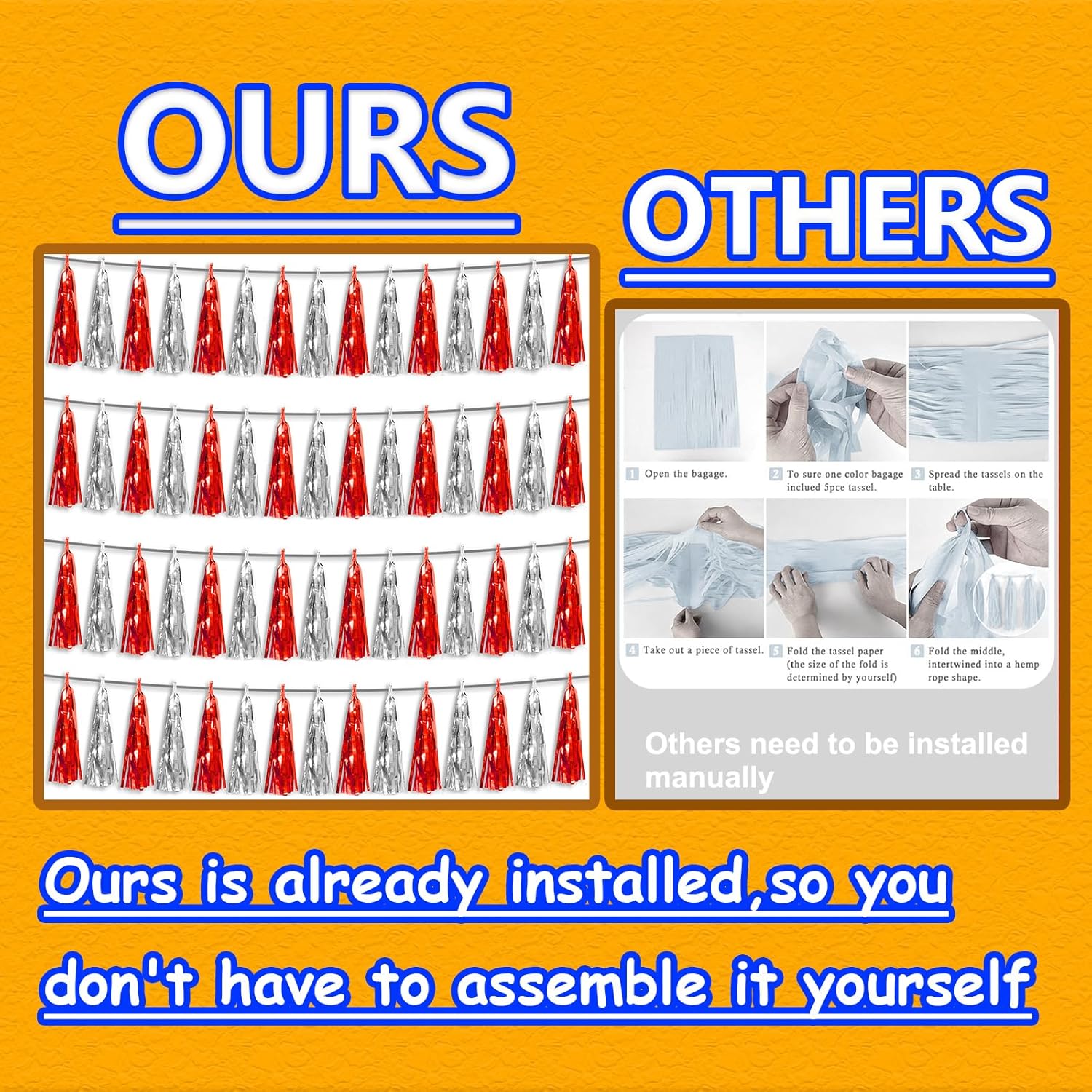• 【Red Silver Party Supplies Set】: The total length of the Red Silver birthday tassels banner is 39.2 feet 60tassels, divided into 4 strips, each 9.8 feet long. Each banner contains 15 tassels, and each tassel measures 14 inches, for birthday decorations many occasions, and so on